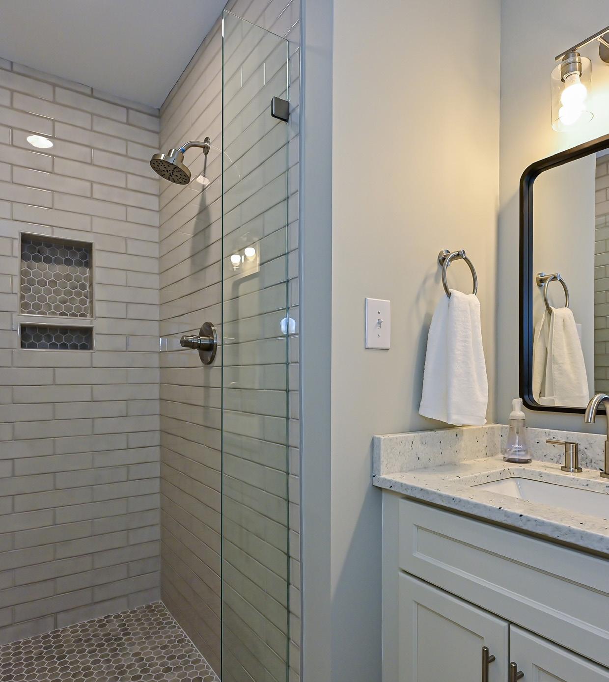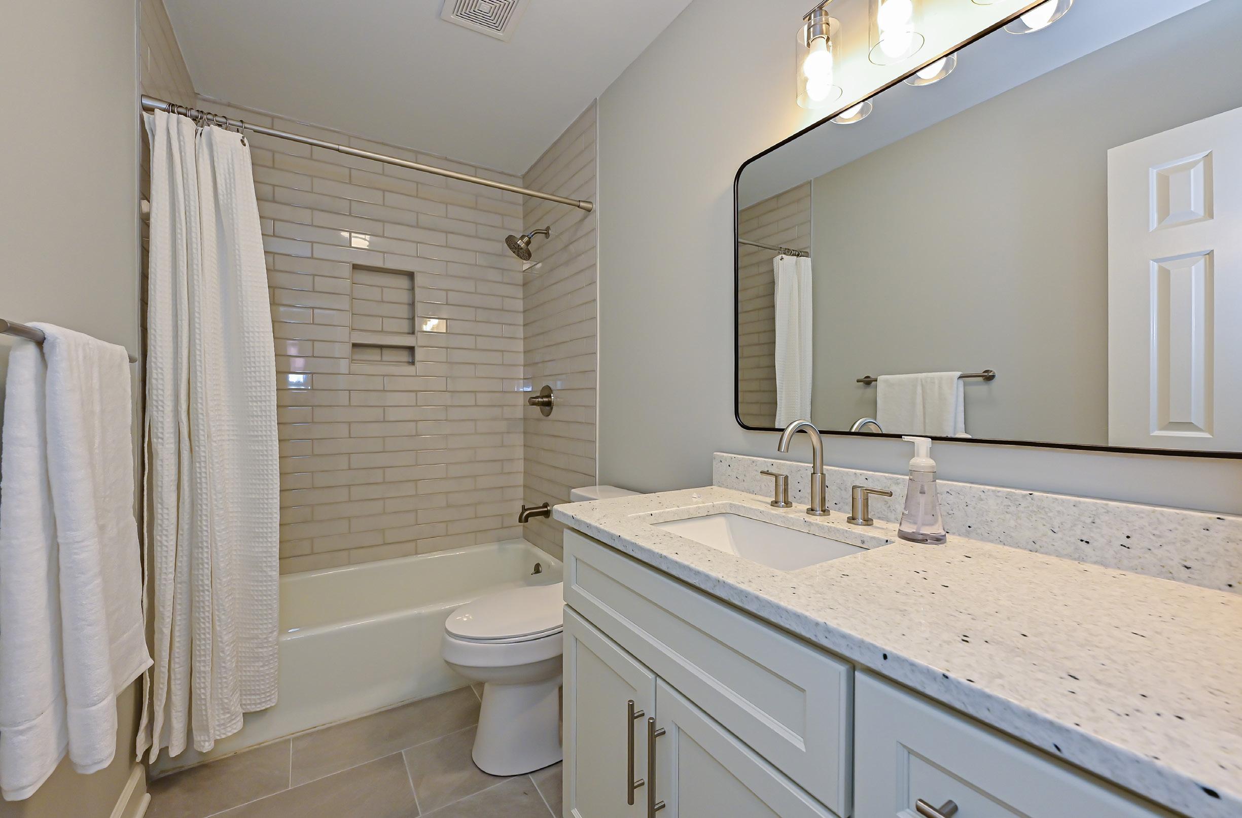 This bath is centrally located to the secondary bedrooms. It features tile flooring, single vanity with storage below and glassed globe lighting above. The tub/shower combination features, floor to ceiling, designer tile with toiletry niche, and a large shower head.