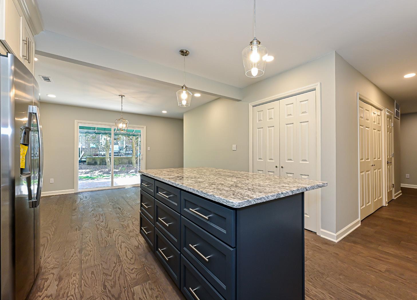 A true delight awaits you in this space. Wood flooring, granite counter tops, SS GE appliances, including an in-cabinet microwave, vent hood over the range/ oven and a side-by-side refrigerator. The cabinetry features self-close doors and drawers and a pantry. A functional work island with pendant lighting above provides space for casual dining, food prep and storage.