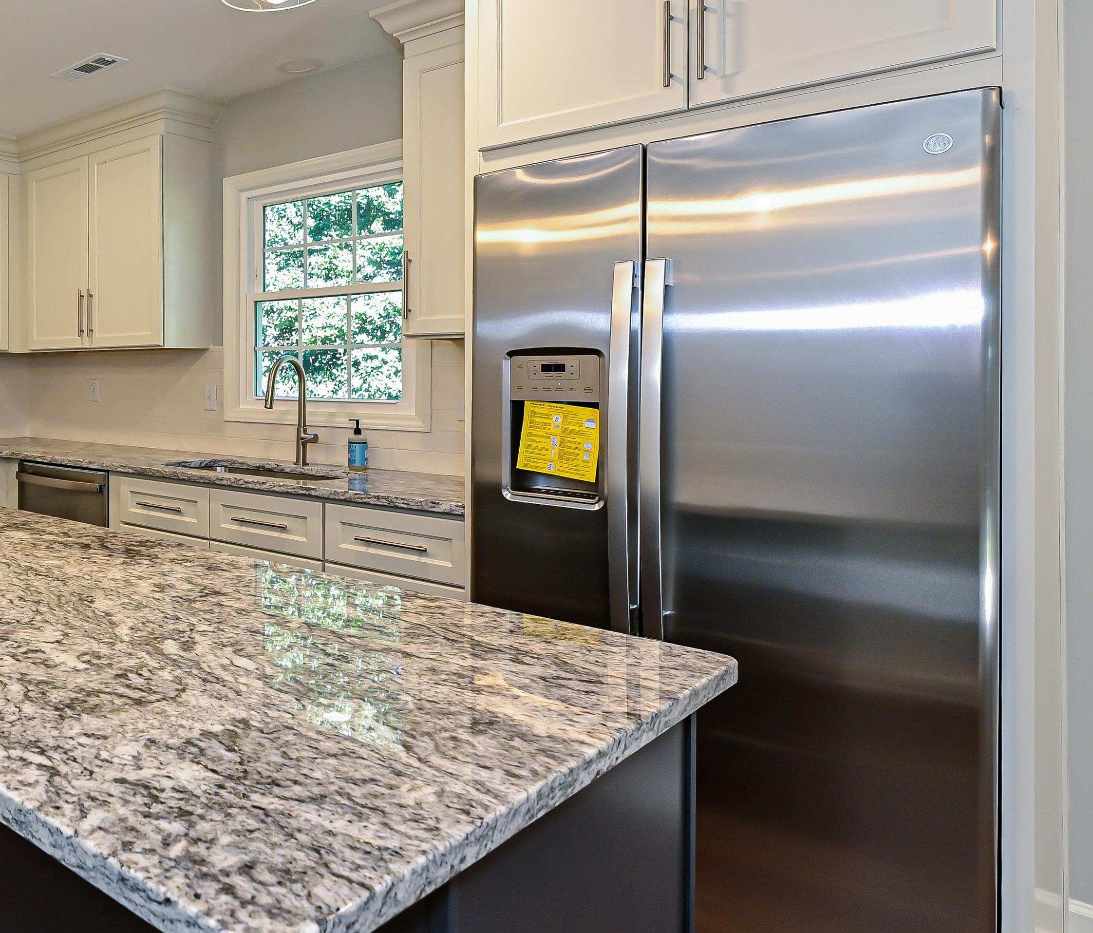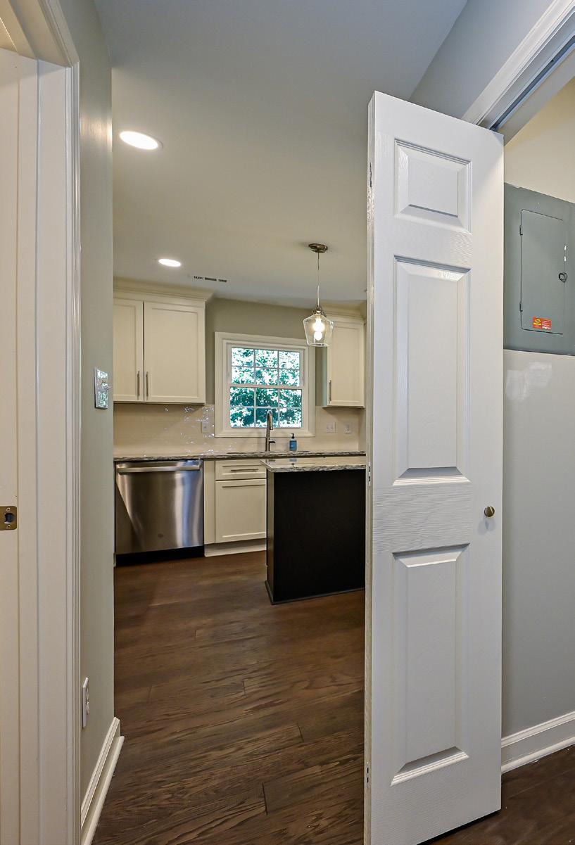 • The kitchen boasts new wood flooring, lighting, cabinetry with soft close drawers and doors, sink, faucet, disposal, shelving cabinet in the closet with the water heater, and all new SS GE appliances. A new island was added.