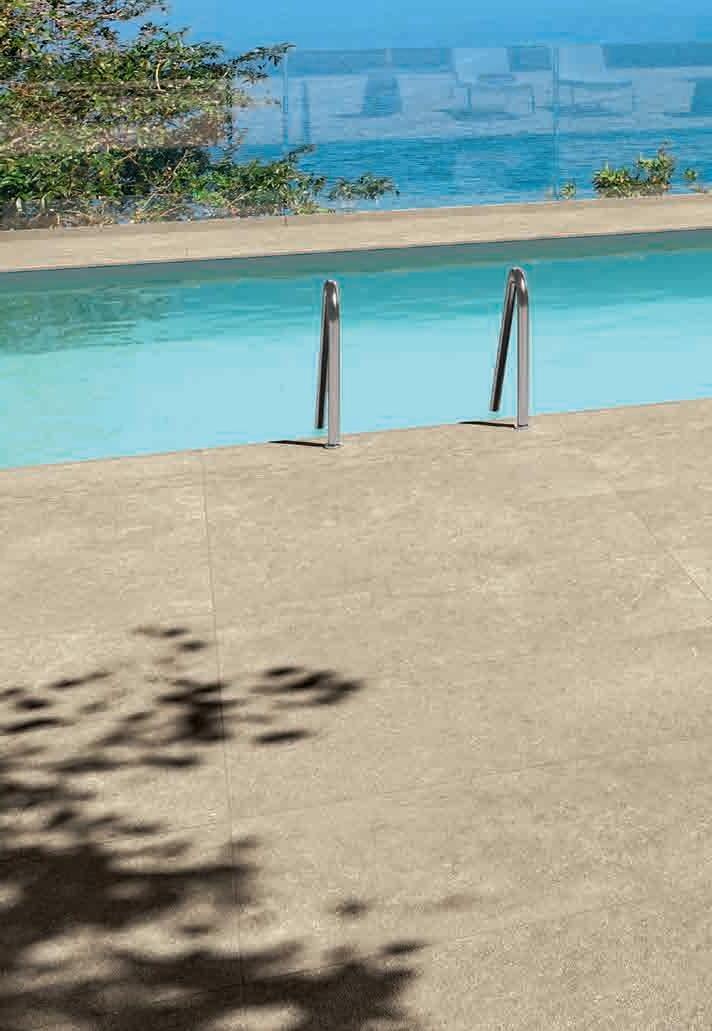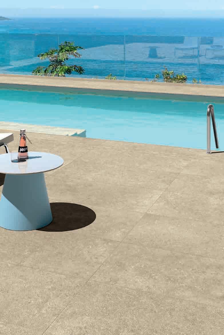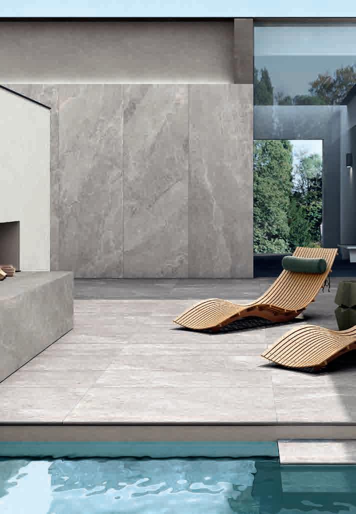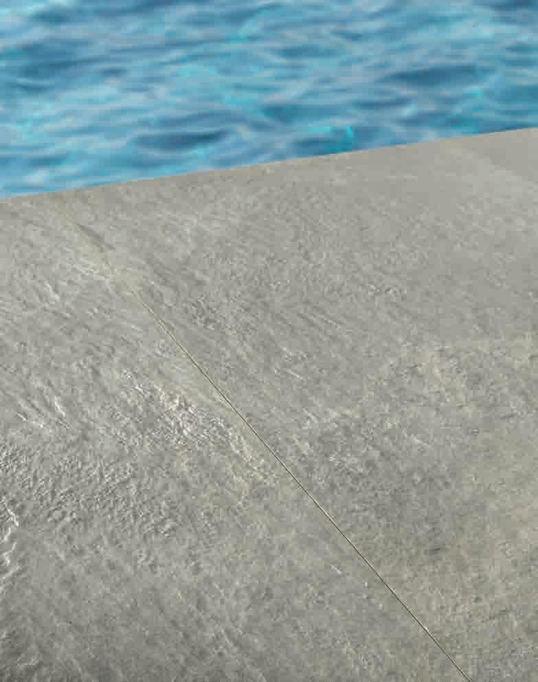 This finish recalls the surface of slate, which features a characteristic ruggedness that highlights the natural appearance and maximises the product’s anti-slip performance (R11C). The surface characteristics and increased thickness (20 mm) make this the perfect material for high-end outdoor contexts, in which the best technical performance must be accompanied by the highest aesthetic standards.