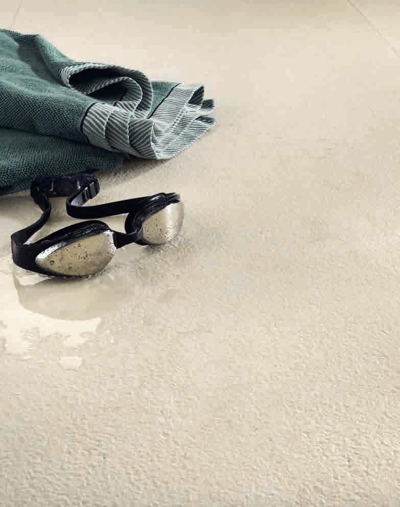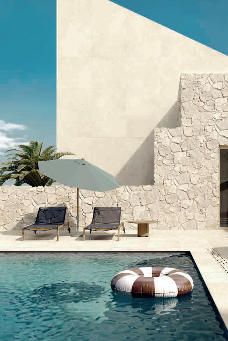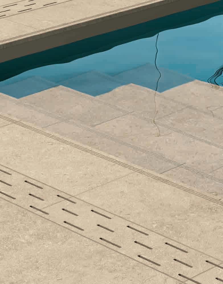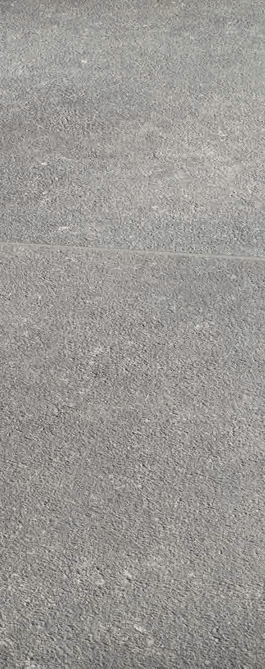 Inspired by the authentic look of natural stone, this surface faithfully reproduces the traditional bush-hammered finish, commonly found in many natural stones and particularly appreciated for outdoor applications thanks to its ability to increase slip resistance. With its matte appearance and intense, sculpted aesthetic, it combines strong visual character with high technical performance, achieving a high slip-resistance rating (R11-C), guaranteed even in wet conditions.