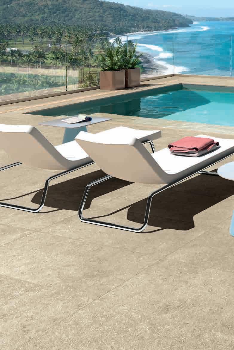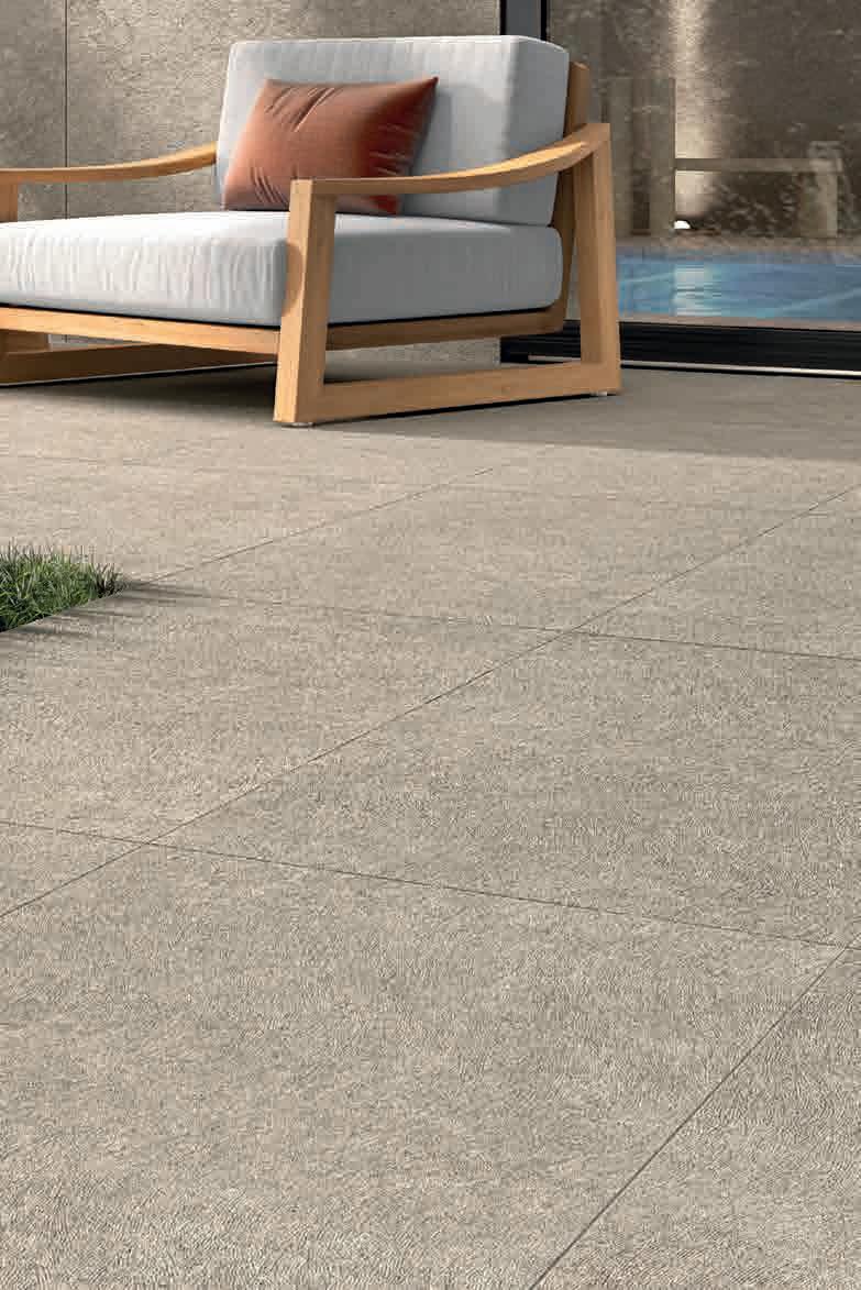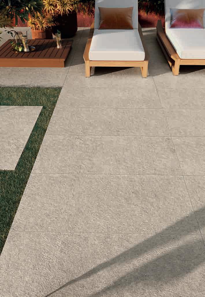 Inspired by split slate, this finish with a substantial roughness maximises its slip resistance (R11). The natural look and the 20 mm thickness make this surface intended for outdoor flooring an alluring and, at the same time, a extremely high-performance one.