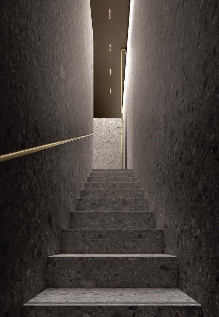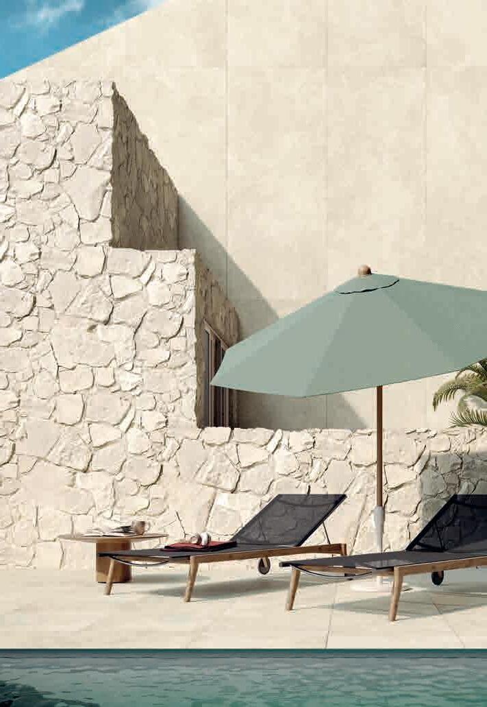 Ispirata all’effetto autentico delle pietre naturali, questa superficie riproduce con preci-sione la tradizionale lavorazio-ne a bocciardatura, proposta in quasi tutte le pietre naturali e particolarmente apprezzata in esterno per la sua capacità di aumentare la resistenza allo scivolamento. Dal riflesso opaco e dall’este-tica intensa e scolpita, coniuga forza espressiva e prestazione tecnica, raggiungendo un elevato grado antiscivolo (R11-C) garantito anche in condizioni di bagnato.