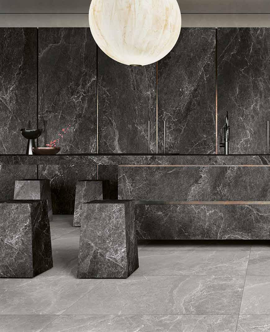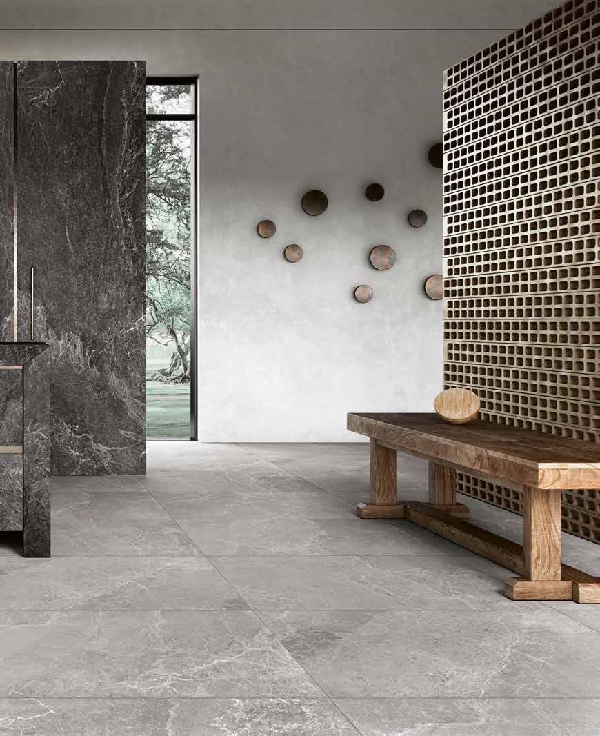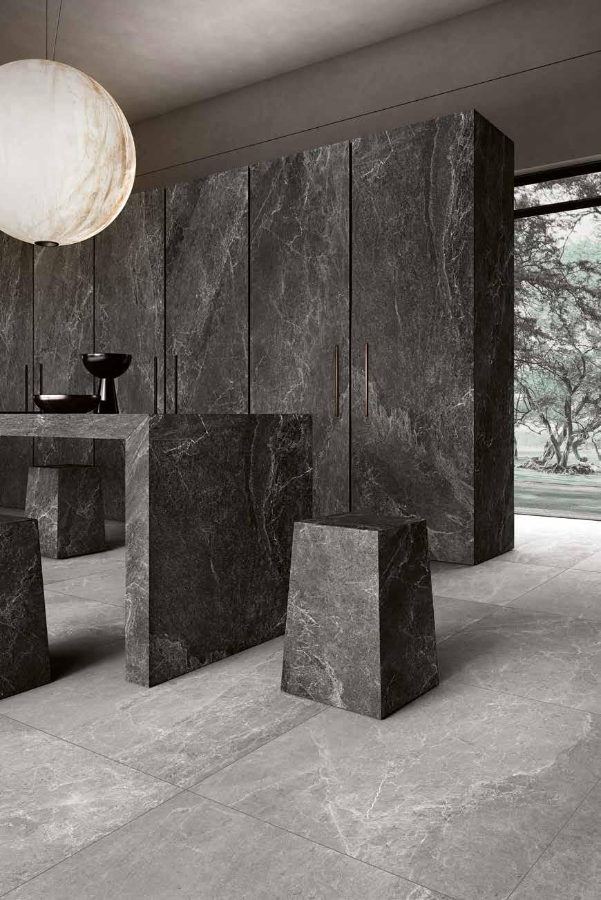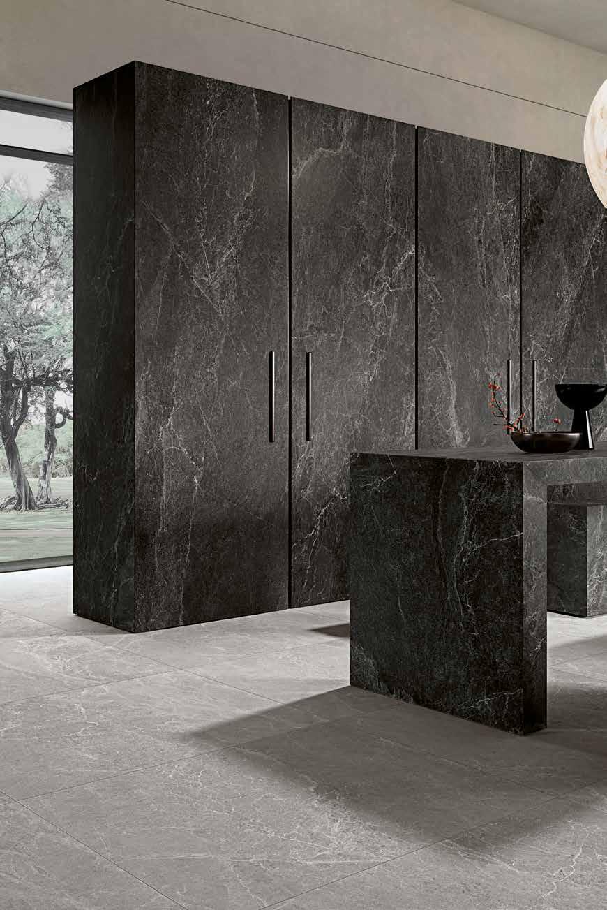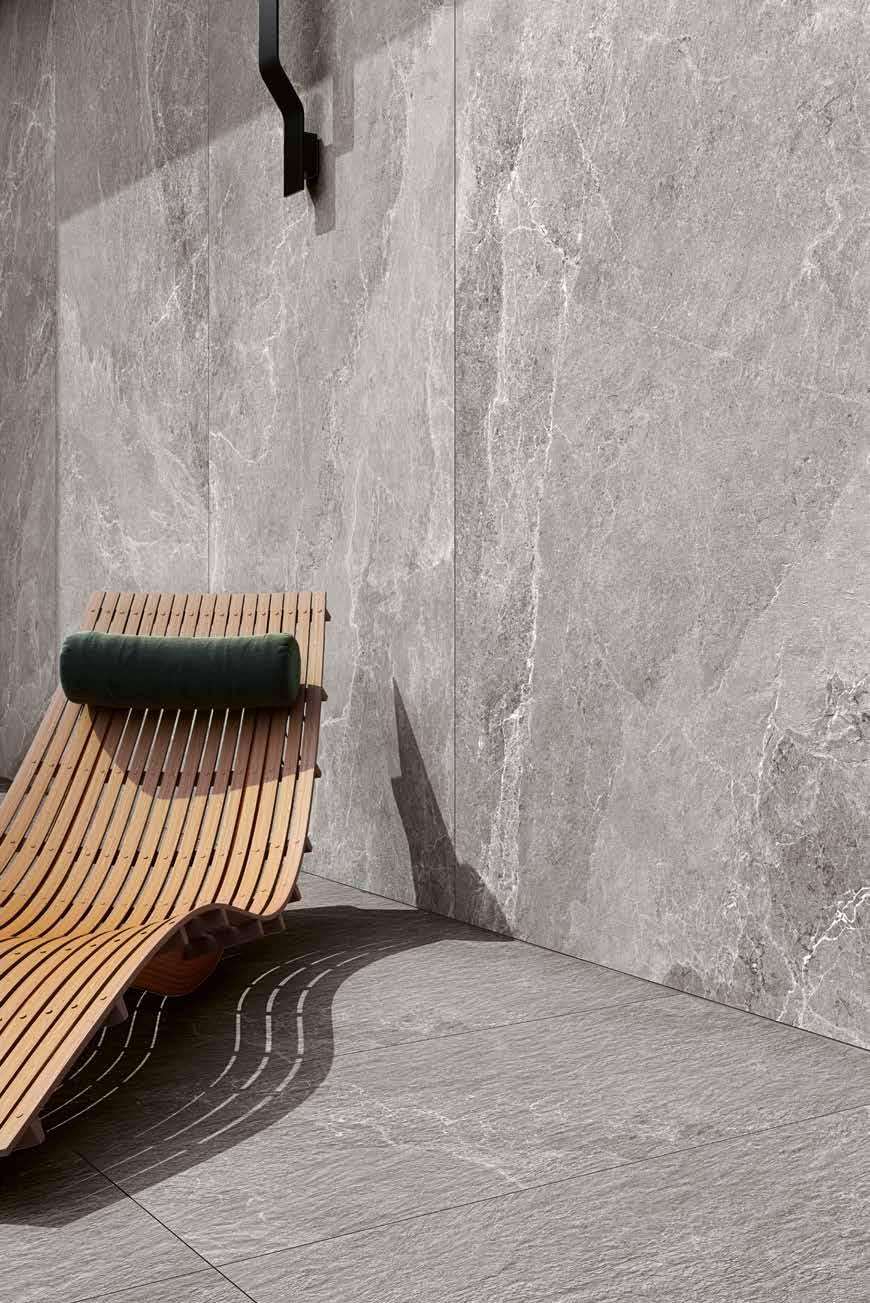 Amalgamati in un’unica tessitura raffinata, convivono diverse texture derivanti da più pietre naturali: sulla trama tipica dell’ardesia, si innestano filigrane marmoree più nette e inclusioni granulari tipiche dei limestone. Il risultato è un effetto pietra modellato sulla sensibilità contemporanea: una sintonia che va oltre il gusto e l’estetica, e arriva a immaginare spazi concreti dove vivere il mirabile connubio di bellezza e qualità.