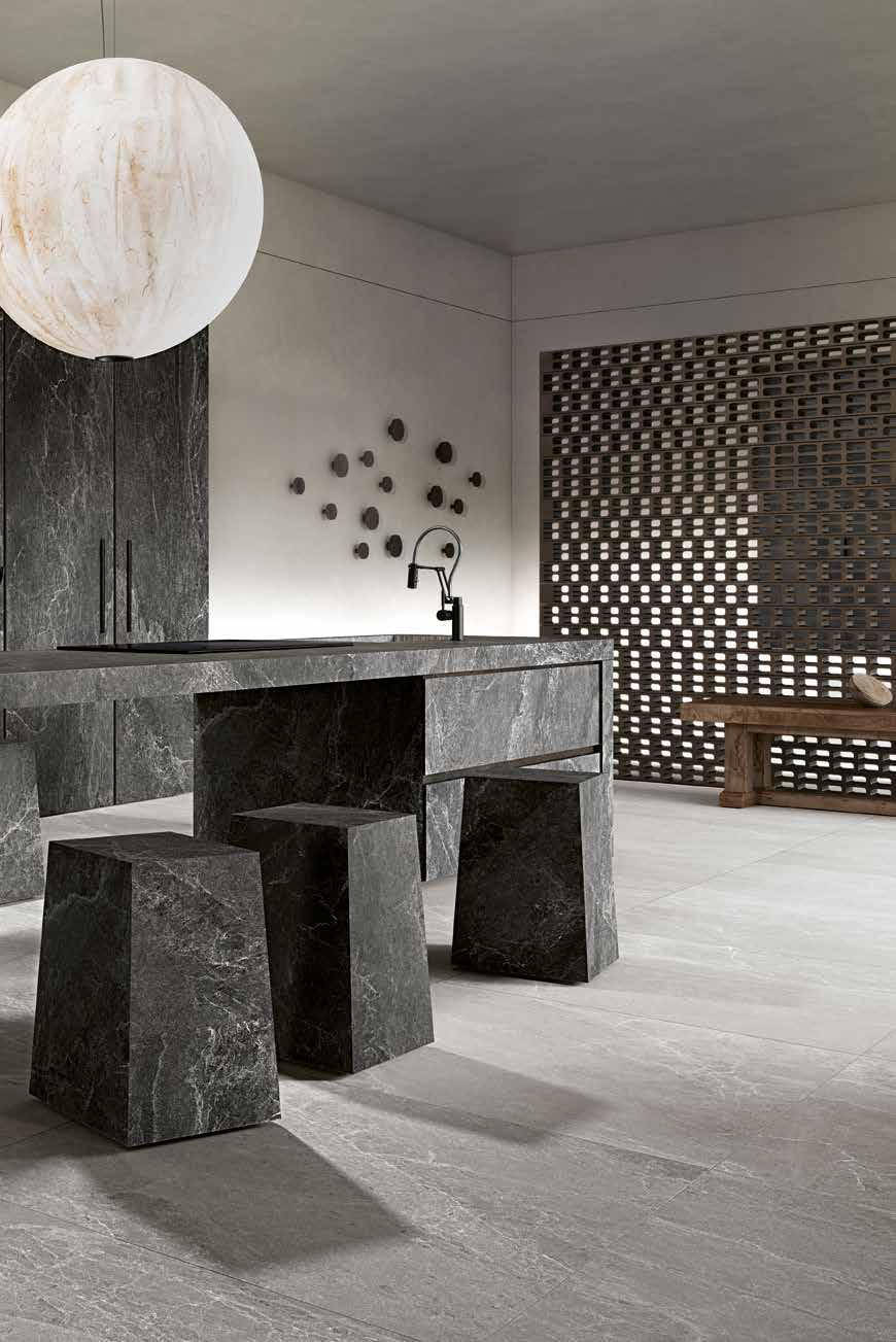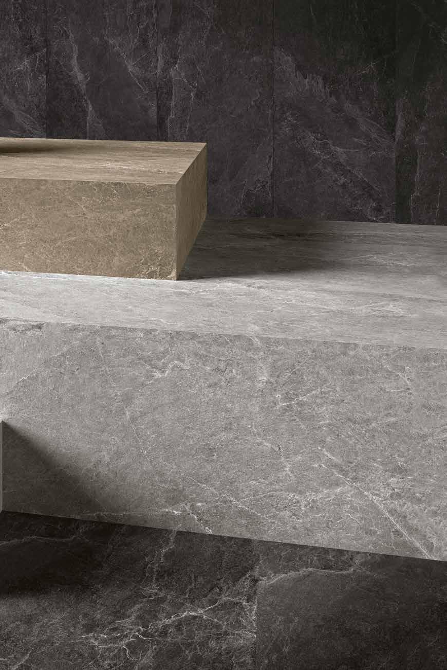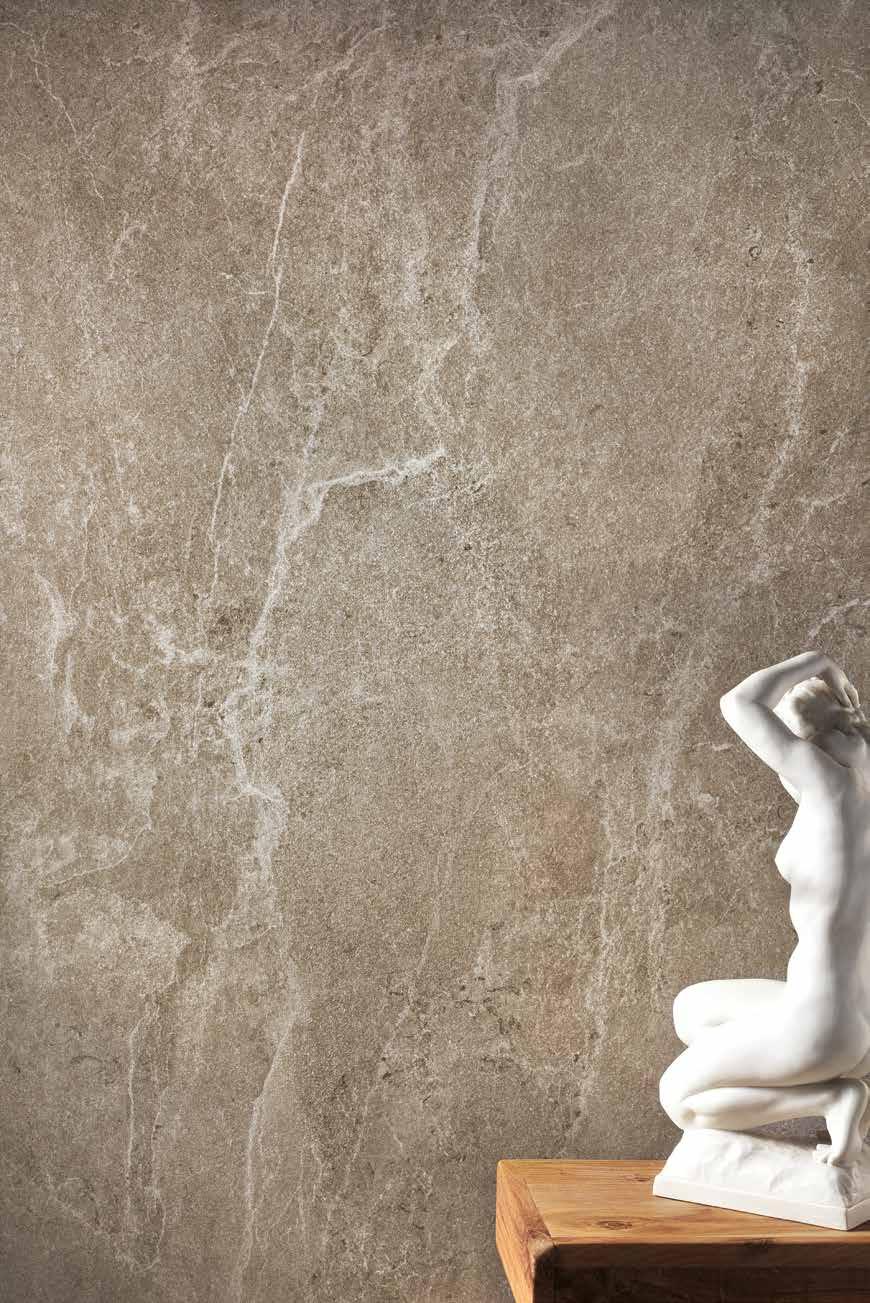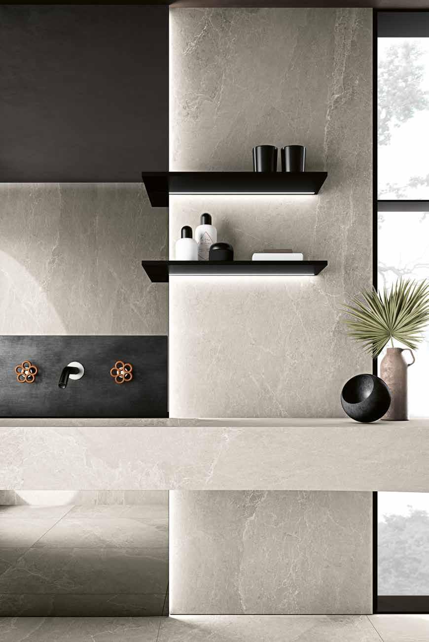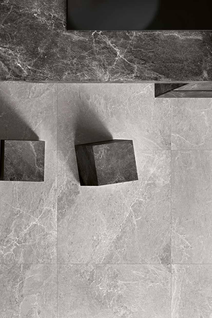 Amalgamati in un’unica tessitura raffinata, convivono diverse texture derivanti da più pietre naturali: sulla trama tipica dell’ardesia, si innestano filigrane marmoree più nette e inclusioni granulari tipiche dei limestone. Il risultato è un effetto pietra modellato sulla sensibilità contemporanea: una sintonia che va oltre il gusto e l’estetica, e arriva a immaginare spazi concreti dove vivere il mirabile connubio di bellezza e qualità.