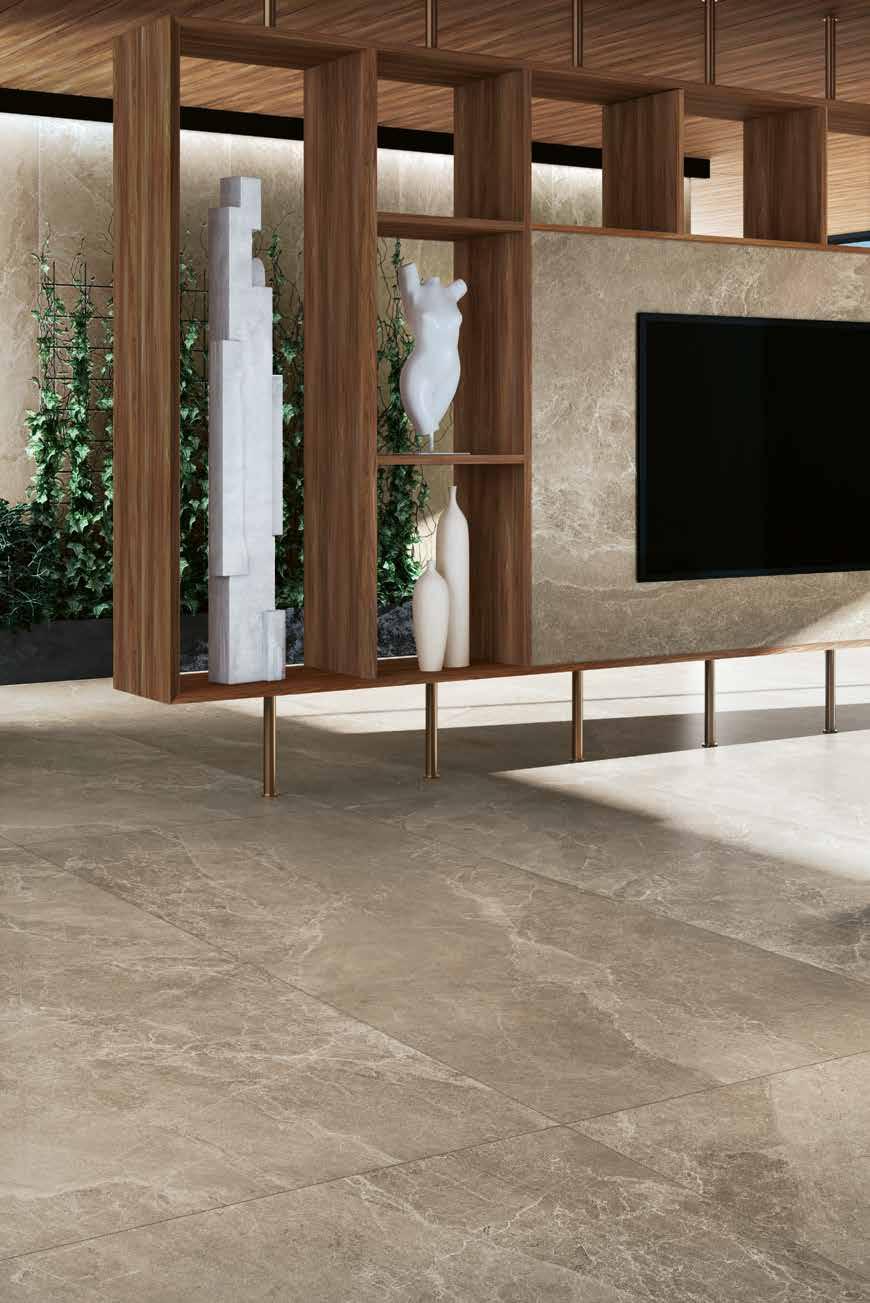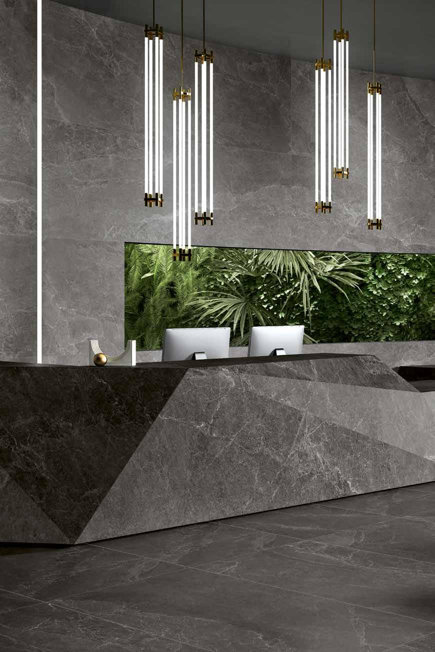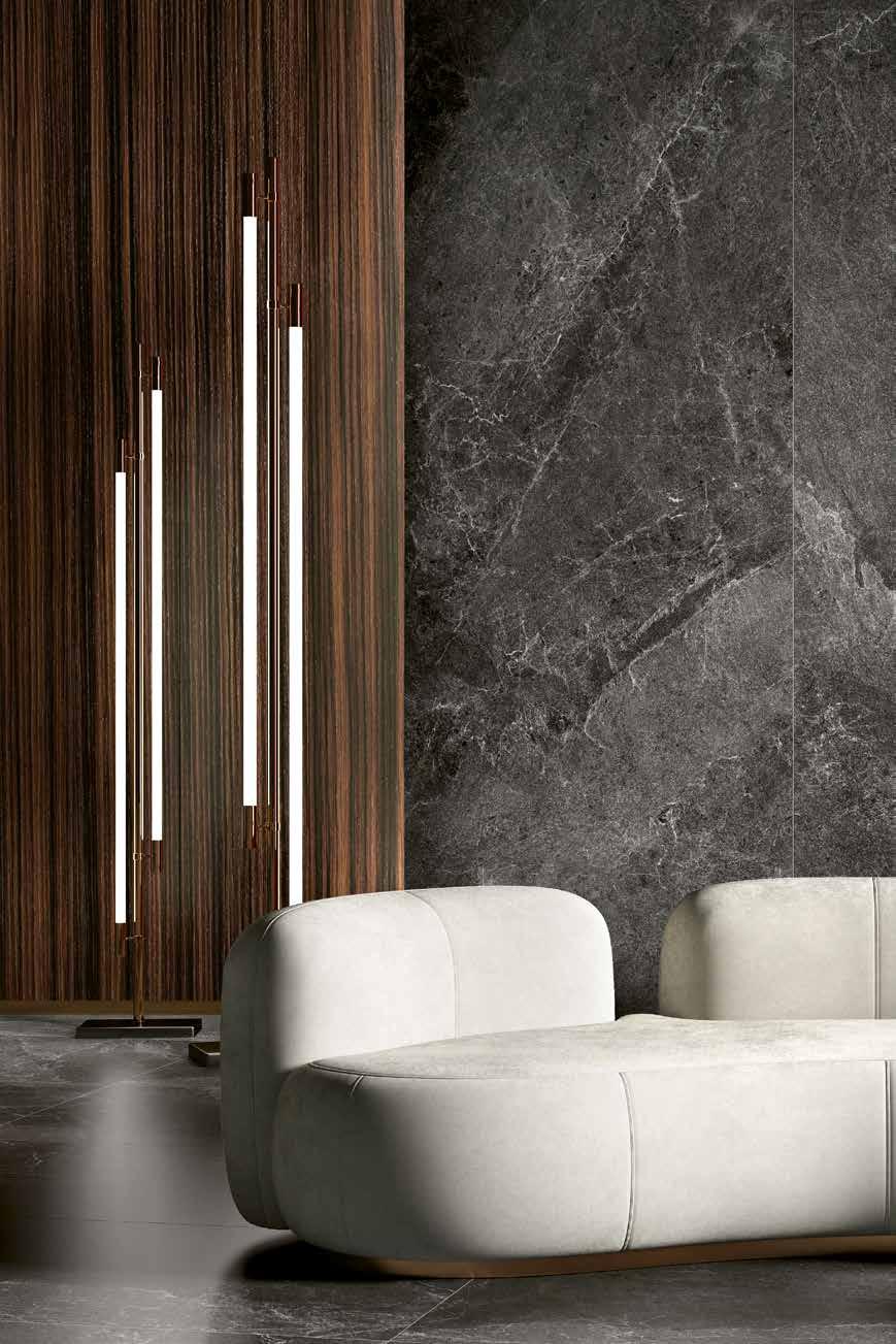 An intense mineral and marble elegance: a calibrated aesthetic amalgam obtained by blending characteristic traits of marble and stone, above all slate. Advanced digital decoration technologies produce a new ceramic material, a mineral look that expresses naturalness through a contemporary aesthetic language.