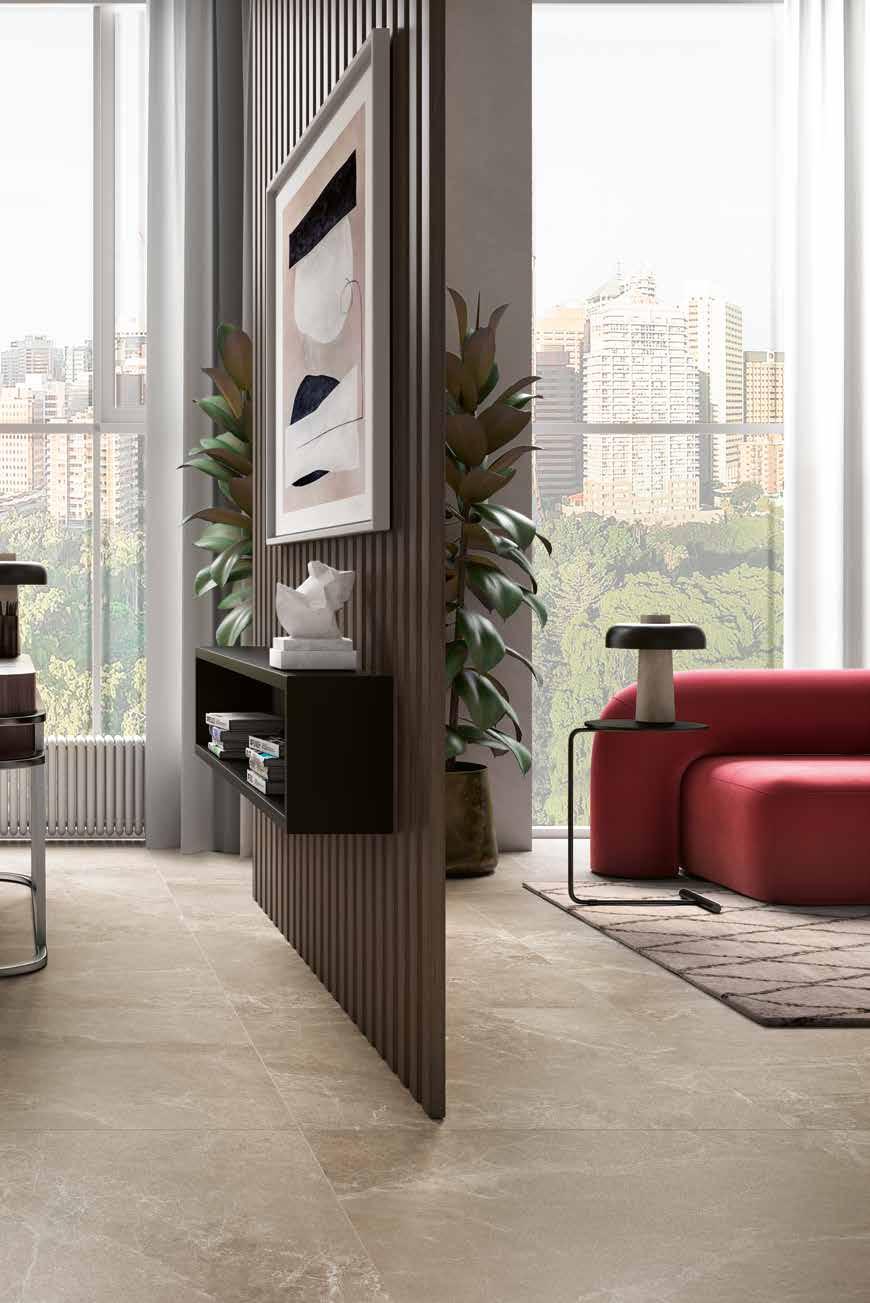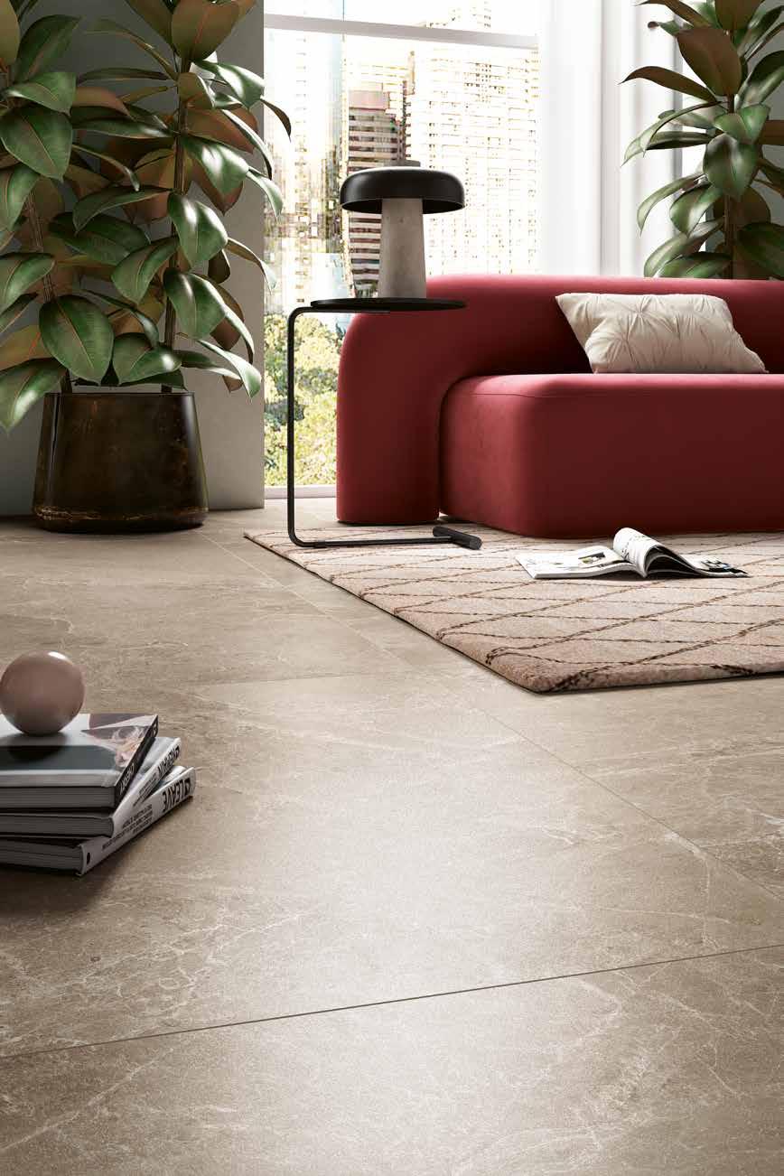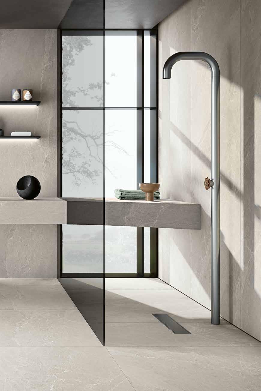 A matte surface, characterised by a subtle texture, conveys all the allure of natural stone, with a modern reinterpretation, thanks to the absence of reflections. The finish, obtained through sophisticated surface applications, offers the best compromise between strength, anti-slip resistance (R10B), and easy cleaning.