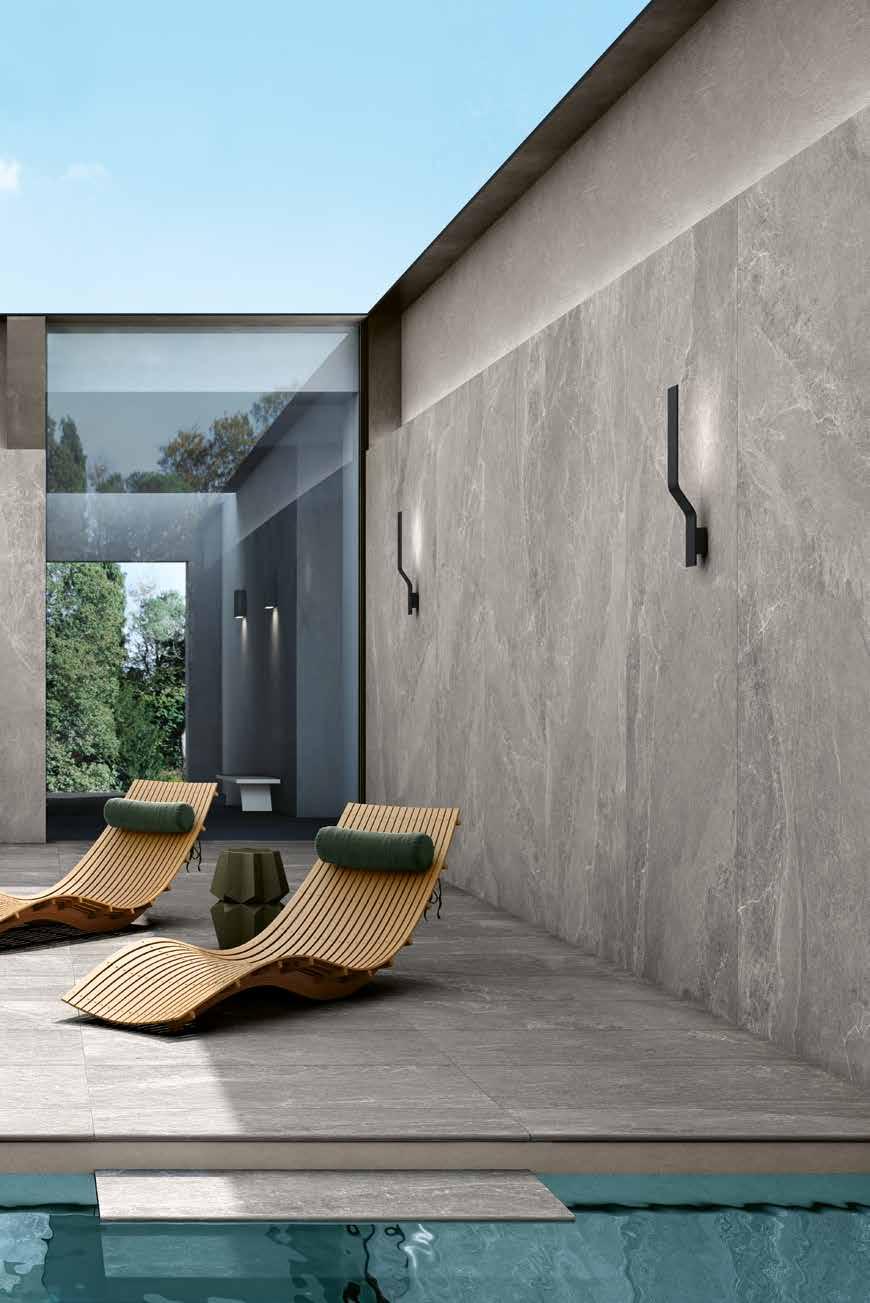 This finish recalls the surface of slate, which features a characteristic ruggedness that highlights the natural appearance and maximises the product’s anti-slip performance (R11C). The surface characteristics and increased thickness (20 mm) make this the perfect material for high-end outdoor contexts, in which the best technical performance must be accompanied by the highest aesthetic standards.