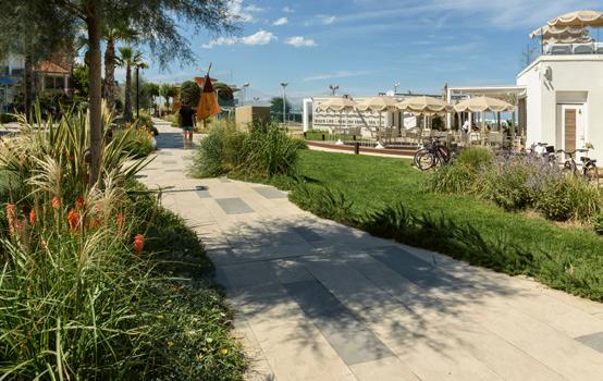 Driveway paving, which can be coordinated with the internal paving. For this type of installation, a joint of at least 5 mm is recommended. The size and position of the expansion joints must be defined by the Works Supervisor. To facilitate the outflow of rainwater, it is always necessary to evaluate the slopes of an external paving; when laying glued onto a screed, the slopes are determined by the latter.