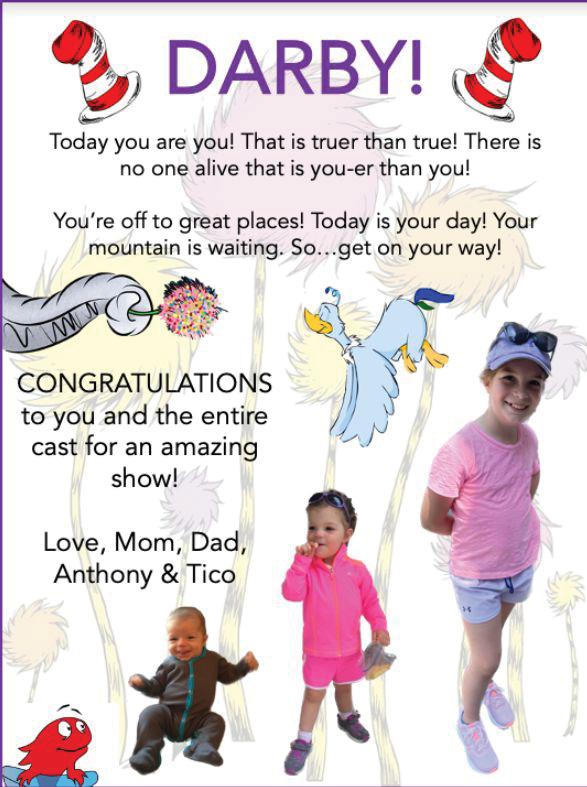 Mommy, Daddy, and Chase are SOOO proud of Zoë to be starring in her musical debut! She’s already the Who’s Who around the house and we know Horton will certainly hear her singing in the ensemble. Your family and all your favorite people are excited to come see you shine on stage in a perfect first show of Seussical the Musical! Have fun, be silly, and break yourself, our love!
