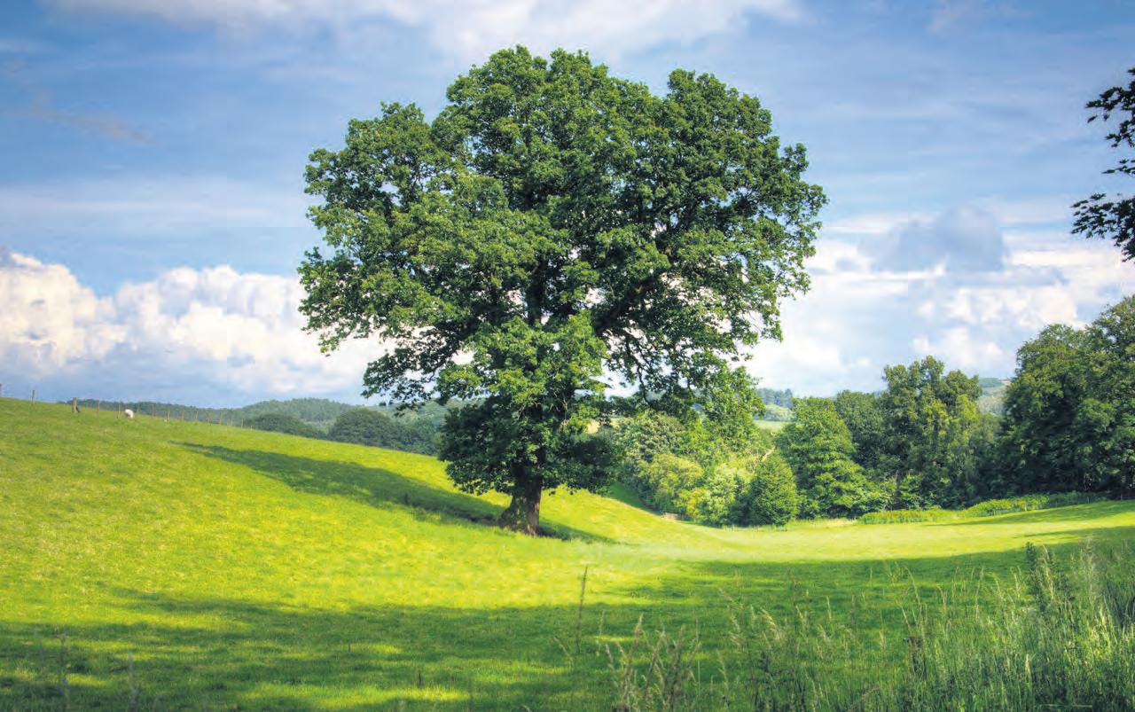 A healthy oak tree. Leaves on a tree are a good indicator of health. Leaves should be the right colour for the season, unless the tree leaves are naturally yellow. They should not be irregularly shaped or stunted. When leaves and stems begin to drop, the tree is stressed