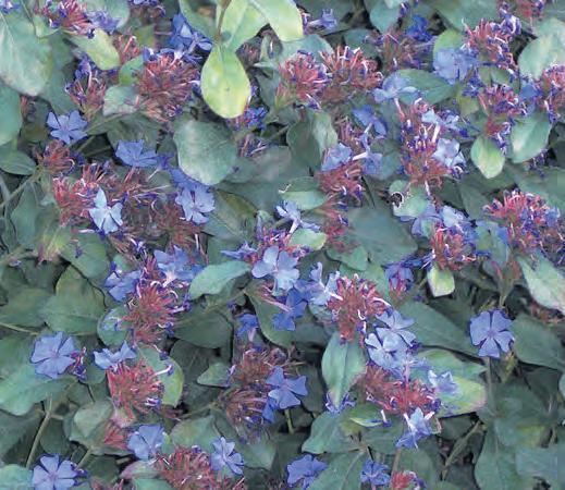 The hardy plumbago, Ceratostigma plumbaginoides, is a low-growing, spreading, woody perennial with slender red stems clothed in bright green leaves, which turn bright red before falling in autumn. However, it's grown mainly for its vivid blue flowers, which appear in small clusters from late summer to mid-autumn. It makes a great ground cover plant and is perfect for adding late colour to the front of the border. It develops tolerance to drought when established. Ceratostigma willmottianum is a small twiggy shrub with dark green pointed leaves. Planted in a sunny spot, the leaves tint with flame and gold as autumn progresses, a lovely combination with the sapphire blue flowers, which are freely produced until the first hard frosts. Late butterflies love it as a source of nectar.