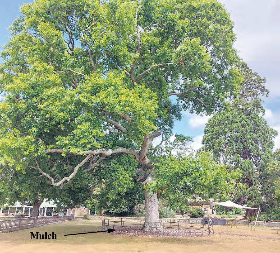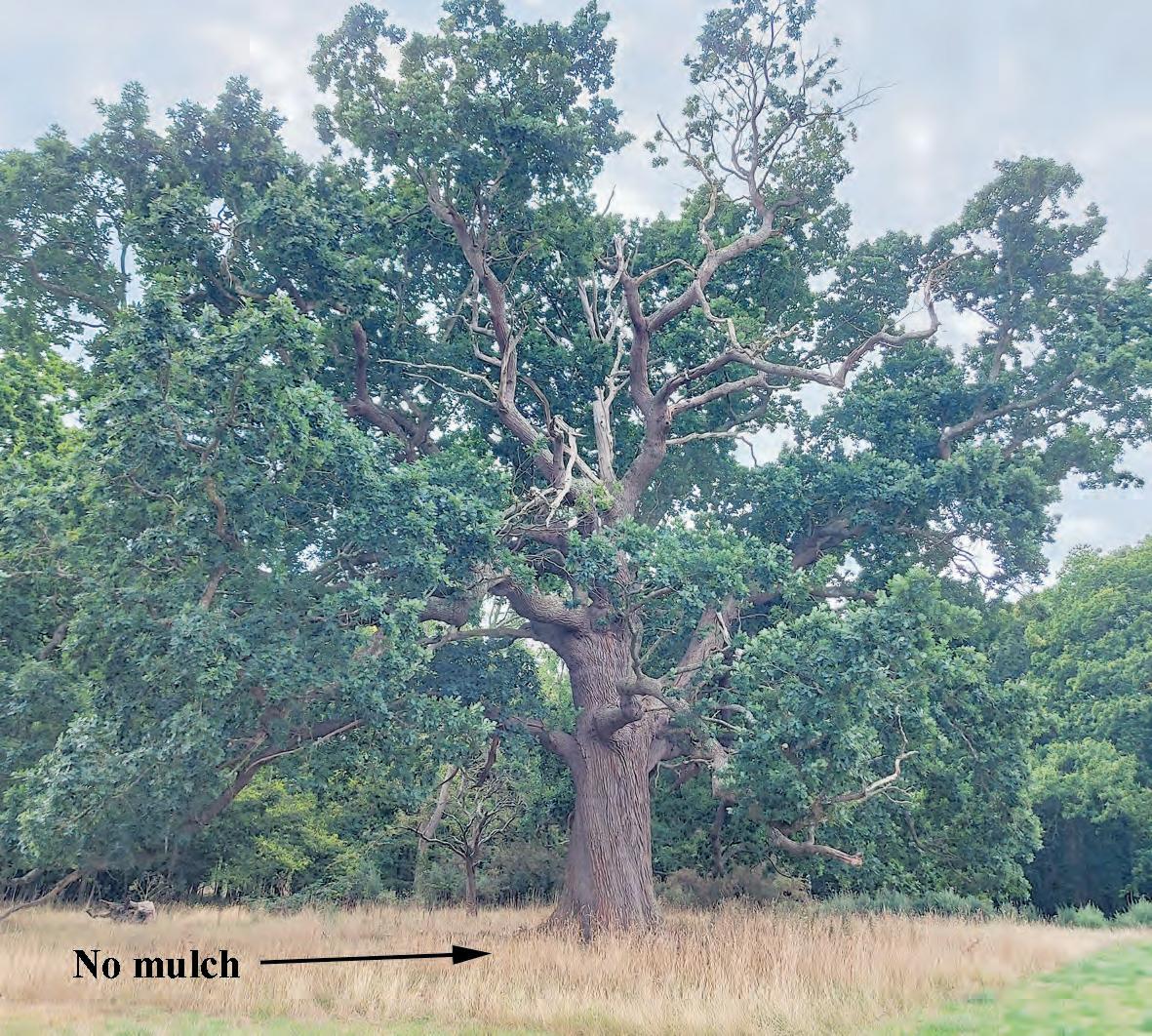 Laying 100mm settled depth of composted woodchip for as wide a circle around the base of the tree as you can, minimum one metre radius up to canopy edge, will give the tree back that woodland soil that it needs to withstand drought.