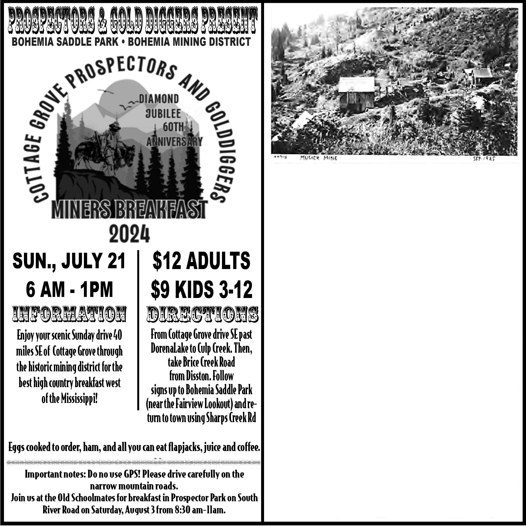 Prospectors and Gold Diggers Club invite you to enjoy a scenic Sunday drive 40 miles SE of Cottage Grove into the heart of the Bohemia Mining District and experience a high country breakfast in a simulated mining camp.