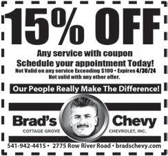 6 | WEDNESDAY, APRIL 17, 2024 / COTTAGE GROVE SENTINEL FREE WIPER BLADES ON ANY SERVICE OF $10000 OR MORE 80408 Delight Valley School Road, Cottage Grove, OR 97424 www.huddleautomotive.com n The Northwest’s Finest Gardening Seed n Flowers, Herbs, & Shrubs n Vegetable Transplants n Fruit Trees 20 Palmer Ave. n Cottage Grove n (541) 942-0510 n The Northwest’s Finest Gardening Seed n Flowers, Herbs, & Shrubs n Vegetable Transplants n Fruit Trees 20 Palmer Ave. n Cottage Grove n (541) 942-0510