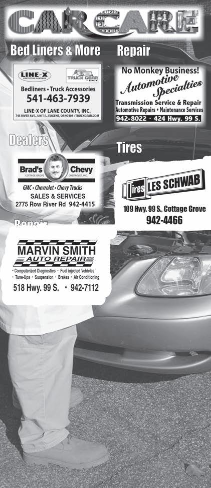 Trust Deed, the words “Trustee” and “Beneficiary” includes their respective successors in interest, if any. Dated: 2/8/24 By: Nathan F. Smith, Esq., OSB #120112 Successor Trustee Malcolm & Cisneros, A Law Corporation Attention: Nathan F. Smith, Esq., OSB #120112 c/o TRUSTEE CORPS 17100 Gillette Ave, Irvine, CA 92614 949-252-8300 NPP0456909 To: COTTAGE GROVE SENTINEL 03/27/2024, 04/03/2024,04/10/2024, 04/17/2024 Dale’s BASIC YARD CARE One time clean up welcome small and large lawns, garden rototilling Storm Damage trees and trash REMOVAL 541-942-3219 C A L L YARD CARE Family owned and operated for over 40 years! Licensed –Bonded –Insured • ccb #107081 Free Estimates –Transferable Warranties 541-689-3151 1-800-643-3340 WWW.no1northwest.com WWW.JIMDOWNINGREALTY.COM Property Management Specialists Honesty – Reliability – Integrity Jim Downing, GRI – Principal Broker downingjim@live.com • Cell: 541-953-0325 Luke Whitten, Broker wekul@live.com • Cell: 541-556-6899 Off 541-942-6077 • Fax: 541-942-3496 616 E. Main Street Cottage Grove, OR 97424 PROPERTY MANAGEMENT Specializing in Powerstrokes • Complete Automotive Repair & Service • A/C, Transmission • Performance & Computer Diagnostics • ASE Certified Factory Ford Master Technician 80408 Delight Valley School Road • 942-2521 Ph:541-942-8522 • rhilgendorf@autoart.biz Available Available inspection and abatement of: • • • Serving the Willamette ● Asbestos ● LEAD ● Mold Abatement & Inspections GALLERY OF SERVICES REAL ESTATE SUSAN BENNETT Real Estate Broker (541) 743-1331 Eugene Track Town Realtors LLC 2295 Coburg Rd. Ste. 203 Eugene, OR 97401 Building stronger communities through home ownership. 590 Pearl St. Suite 310 | Eugene, OR 97401 or log on to: Shelly Dement - Independent Agent Over 20 Years Experience Shelly D Insurance, Inc. Phone: 541-942-3191 Email: shellydinsurance@msn.com Local Independent Insurance Agent Since 1993. Medicare Advantage Plans Medicare Supplement Plans - Employer Group Plans - Individual and Family Plans Proudly Representing Many Carriers Including: We do not offer every plan available in your area. Currently we represent 9 out of 10 organizations which offer 35 out of 37 Medicare Advantage products in your area and 6 out of 21 Medicare Supplements that are available in your area. Please contact Medicare.gov, 1–800–MEDICARE, or your local State Health Insurance Program (SHIP) to get information on all of your options. Over 30 Years Experience 541-942-3325 | cgsetinel.com to the Cottage Grove Sentinel. 541-649-1616 or cgsentinel.com PUBLIC NOTICES PUBLIC NOTICES AUTO ART BODY & PAINT Uni-Body & Frame Collision Repair 225 Davidson Ave. • 942-8522 Auto Body & Paint Auto Dealers Auto Insurance COTTAGE GROVE CHEVROLET Oldsmobile • Pontiac • Chevy Trucks SALES & SERVICES 2775 Row River Rd 942-4415 FARMERS INSURANCE GROUP Jim Goodling • Mike Grant 330 Hwy 99 South, Ste C • 942-0165 Tires HERB’S AUTOMOTIVE ‘ Expert Automotive Service Since 1980 All work guaranteed! 926 E. Main 942-7528 Marvin Smith’s Auto Repair • Tune-Ups • Air Conditioning • Brakes • Fuel-Injection Automotive Computerized Diagnostics 518 Hwy. 99 South • 942-7112 AUTOMOTIVE SPECIALTIES Transmissions & Clutches 424 Hwy. 99 S. • 942-8022 VILLAGE GREEN CHEVRON Automotive Repair, Foreign & Domestic 670 Row River Rd. • 942-2131 JIM'S TIRE FACTORY Alignment • Brakes • Batteries Shocks & Struts 302 Hwy 99 S. 942-3831 LES SCHWAB TIRE CENTER 109 Hwy 99, Cottage Grove 942-4466 TAYLOR’S TOWING & AUTO WRECKING 78869 Thornton Ln Cottage Grove 942-4356 Auto Repair Auto Repair Cont Brad’s KENDALL AUTO CENTER • DODGE • CHRYSLER • JEEP • FORD • GMC • HYUNDAI 2800 Row River Rd • Cottage Grove 942-5551 Auto Wrecking Spaces available as low as $19/mo. Become a Car Care Directory Member! GMC • Chervolet • Chevy Trucks SALES & SERVICE 2775 Row River Rd • 541-942-4415 518 Hwy. 99 S. • 541-942-7112 PUBLIC NOTICES PUBLIC NOTICES PUBLIC NOTICES PUBLIC NOTICES Country Media has immediate openings for Reporters to cover the news that matters to our communities. Successful applicants will have an enthusiasm to cover enterprise journalism, civic meetings, school news, community events, and more. You’ll be writing for multimedia platforms including print, social media, and websites. If writing is your passion, this is the job for you! Positions are Full-time. We will also consider applicants for freelance work. We offer an above average wage with paid holidays, health insurance, paid vacation, sick leave, and more! Submit your resume and cover letter today to Executive Editor, jwarren@countrymedia.net. Reporters JOIN OUR TEAM Country Media has immediate openings for advertising representatives. Sales experience is preferred, but not required for the right person. You do need to enjoy meeting people and learning about their business needs, and you must be able to ask for the sale! You must be dependable, with reliable transportation. You should have the drive to succeed in a goal-oriented, highly accountable fun environment. We offer a competitive wage plus unlimited commission potential. This is a full-time job, Monday through Friday! Benefits include paid holidays, health insurance, paid vacation, sick leave, and more! Submit your resume and cover letter today to Director of Sales, fperea@countrymedia.net. Advertising Representatives JOIN OUR TEAM Reduce • Recycle • Reuse