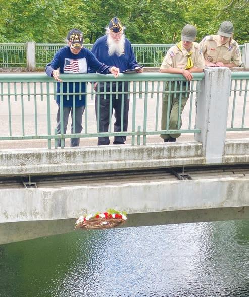 as the Scouts retrieved the American and State of Oregon flags and concluded the first part of the commemorative events. Participants regrouped at Veterans Park, on the corner of Main and River Road, to drop a red, white and blue ceremonial wreath into the Coast Fork of the Willamette River from the Main Street bridge. Army Specialist SP-5