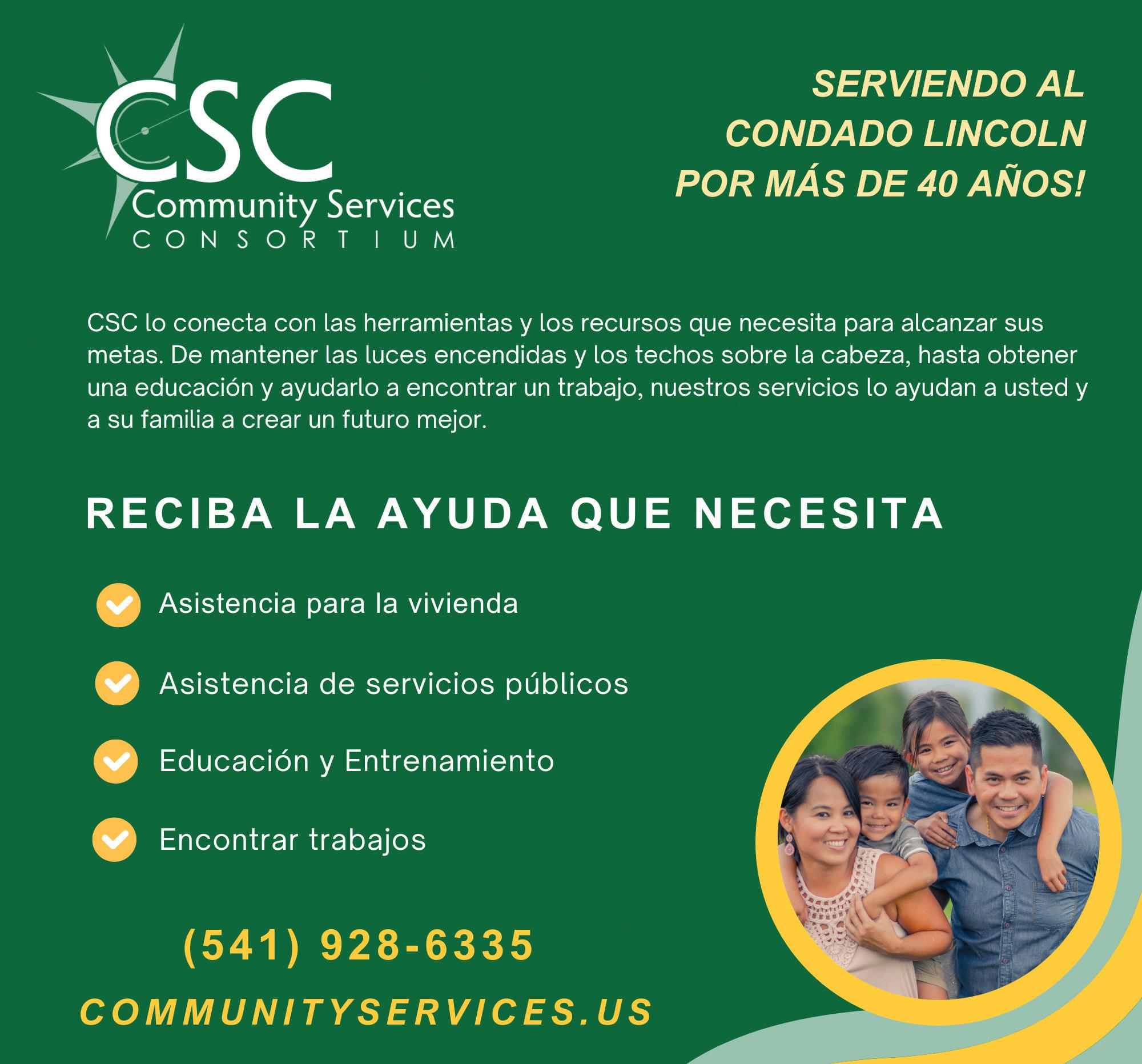 Obtenga la ayuda que necesita con el Consorció de Servicios Comunitarios (como es nombrado por sus signos en inglés, Community Services Consortium (CSC)). Desde mantener las luces encendidas y los techos sobre