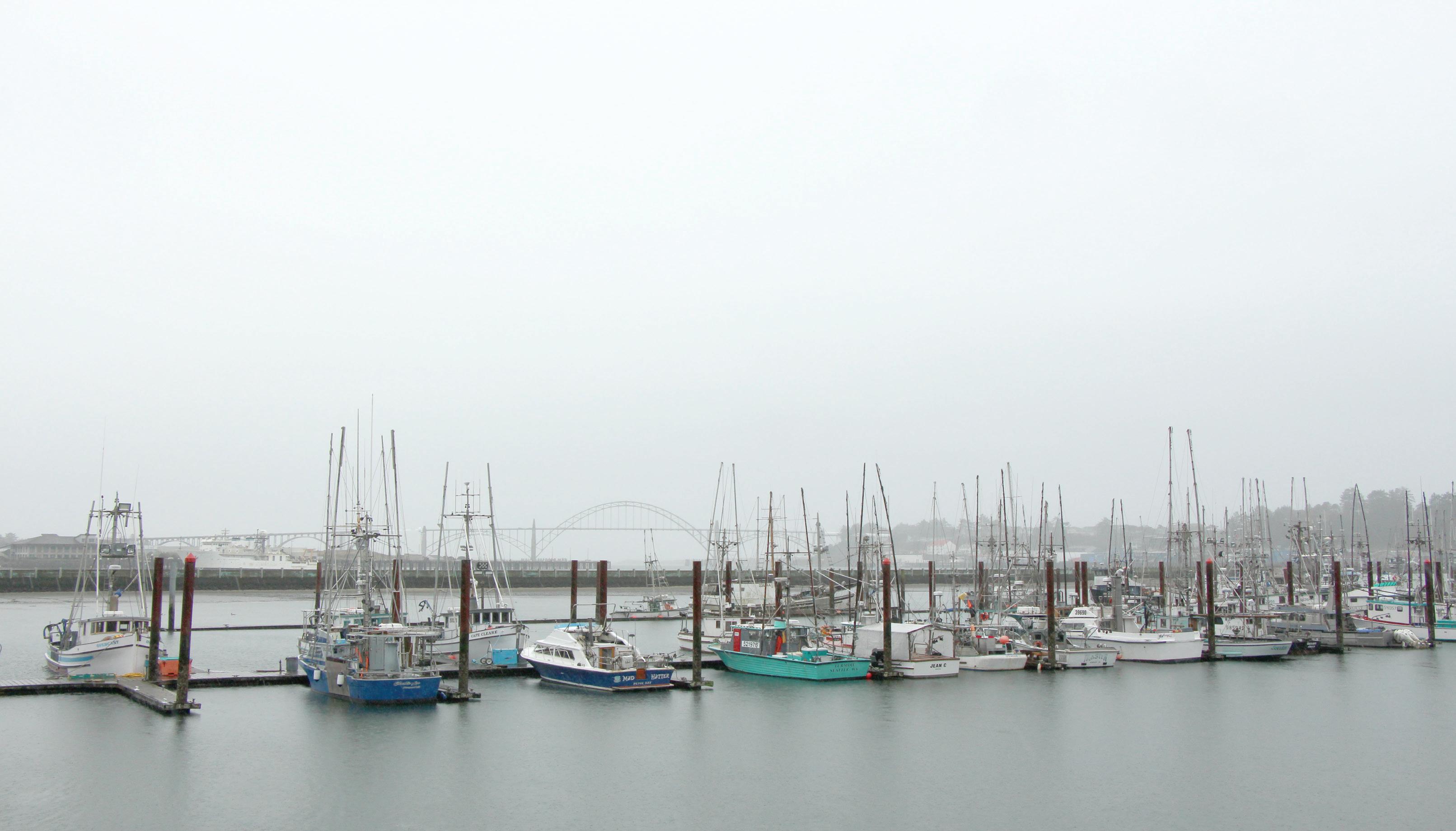 Barcos descansando en la bahía de Newport a lo largo de la costa de Oregón. Vea más momentos costeros en newsguard.com.