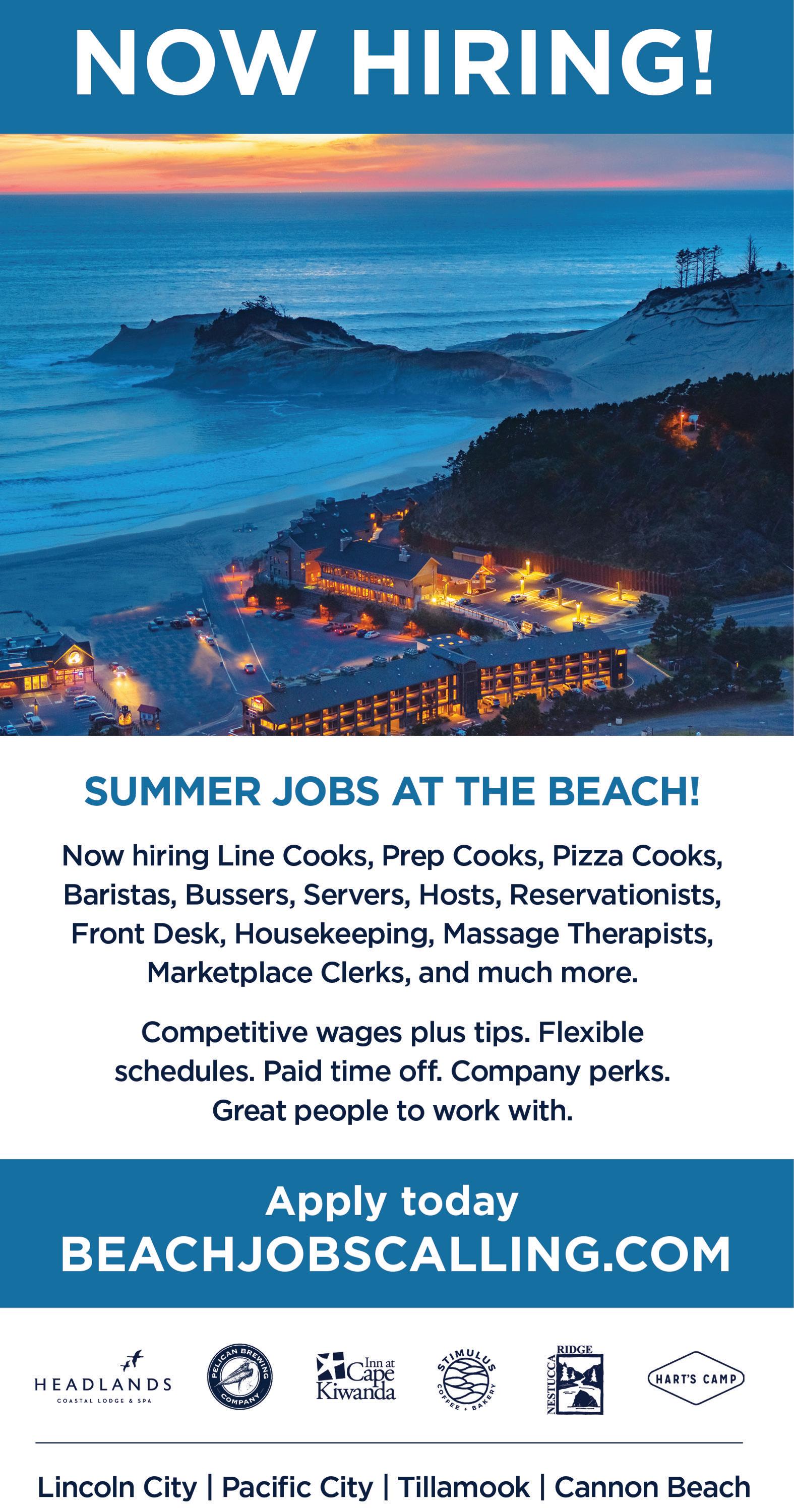 creíbles vistas de la bahía y las increíbles cervezas locales por las que Pelican es famoso. Pelican ahora está contratando a Line Cooks, Prep Cooks, Bussers, Servers, Hosts y mucho más. Solicite en persona en la Feria de Empleo el jueves 18 de mayo de 2 p. m. a 7 p. m. y el sábado 20 de mayo de 9 a. m. a 12 p. m. en 5911 SE Hwy 101 en Lincoln City. Pelican ofrece salarios competitivos más propinas, horarios flexibles, tiempo libre pagado, beneficios de la empresa y excelentes personas con las que trabajar. Obtenga más información en BeachJobsCalling.com.
