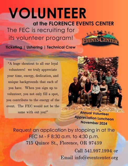 Thank you to all our volunteers at The Florence Events Center. We are grateful for your willingness to give your time, energy, and talents. Your continued support allows us to continue fulfilling our mission and serving people in our community every year.