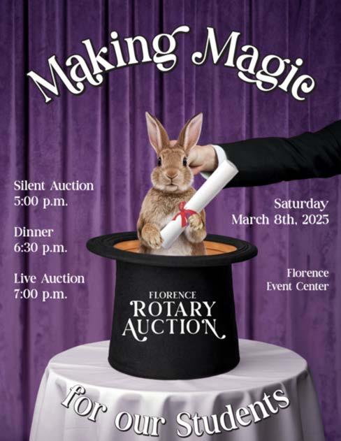 The Rotary Club of Florence is organizing its 65th annual Rotary Auction! The event will take place Saturday, March 8, 2025 at the Florence Events Center. Making Magic for our Students. Last year, the auction raised over $100,000! The funds were used for Siuslaw and Mapleton High School student scholarships, Lane Community College scholarships, and other community projects here in Florence.