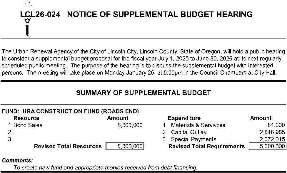 sold at a trustee’s sale may have been used in manufacturing methamphetamines, the chemical components of which are known to be toxic. Prospective purchasers of residential property should be aware of this potential danger before deciding to place a bid for this property at the trustee’s sale. You may reach the Oregon State Bar’s Lawyer Referral Service at 503-684-3763 or toll-free in Oregon at 800-452-7636 or you may visit its website at: www.osbar.org. Legal assistance may be available if you have a low income and meet federal poverty guidelines. For more information and a directory of legal aid programs, go to http://www. oregonlawhelp.org. Any questions regarding this matter should be directed to Lisa Summers, Paralegal, (541) 686-0344 (TS #30057.31725). DATED: October 30, 2025. Nancy K. Cary, Successor Trustee, Hershner Hunter, LLP, P.O. Box 1475, Eugene, OR 97440. 1/21/26 1/28/26 2/4/26 2/11/26 LCL26-027 IN THE CIRCUIT COURT OF THE STATE OF OREGON FOR LINCOLN COUNTY PROBATE DEPARTMENT. In the Matter of the Estate of: JOAN ELIZABETH SNYDER, Deceased. Case No. 25PB11201. NOTICE TO INTERESTED PERSONS. NOTICE IS HEREBY GIVEN that the undersigned has been appointed personal representative of the above estate. All persons having claims against the estate are required to present the same within four months from this date at the law offices of Watkinson Laird Rubenstein, P.C., 1246 N.E. Seventh Street, Suite B, Grants Pass, Oregon 97526; claims not so presented may be barred. The rights of the heirs and devisees may be affected by this proceeding. Additional information may be obtained from the Court records, the personal representative or the attorneys for the estate. Dated and Published: January 21, 2026. Stephen J. Snyder, Personal Representative 1/21/26 LCL26-026 IN THE CIRCUIT COURT OF THE STATE OF OREGON FOR THE COUNTY OF LINCOLN Probate Department. Case No.: 26PB00206. NOTICE TO INTERESTED PERSONS. In the Matter of the Estate of Ann Munro Snow, Deceased. NOTICE IS HEREBY GIVEN that Susan F. Snow has been duly appointed as Personal Representative. All persons having claims against the estate are required to present them to the undersigned attorney for the personal representative at 1211 SW Fifth Avenue, Suite 1900, Portland, OR 97204, within four months after the date of publication of this notice, or the claims may be barred. All persons whose rights may be affected by the proceedings may obtain additional information from the records of the Court, the Personal Representative, or the attorney for the Personal Representative. Dated and published on January 21, 2026. Susan F. Snow, Personal Representative, 14075 NW Old German-