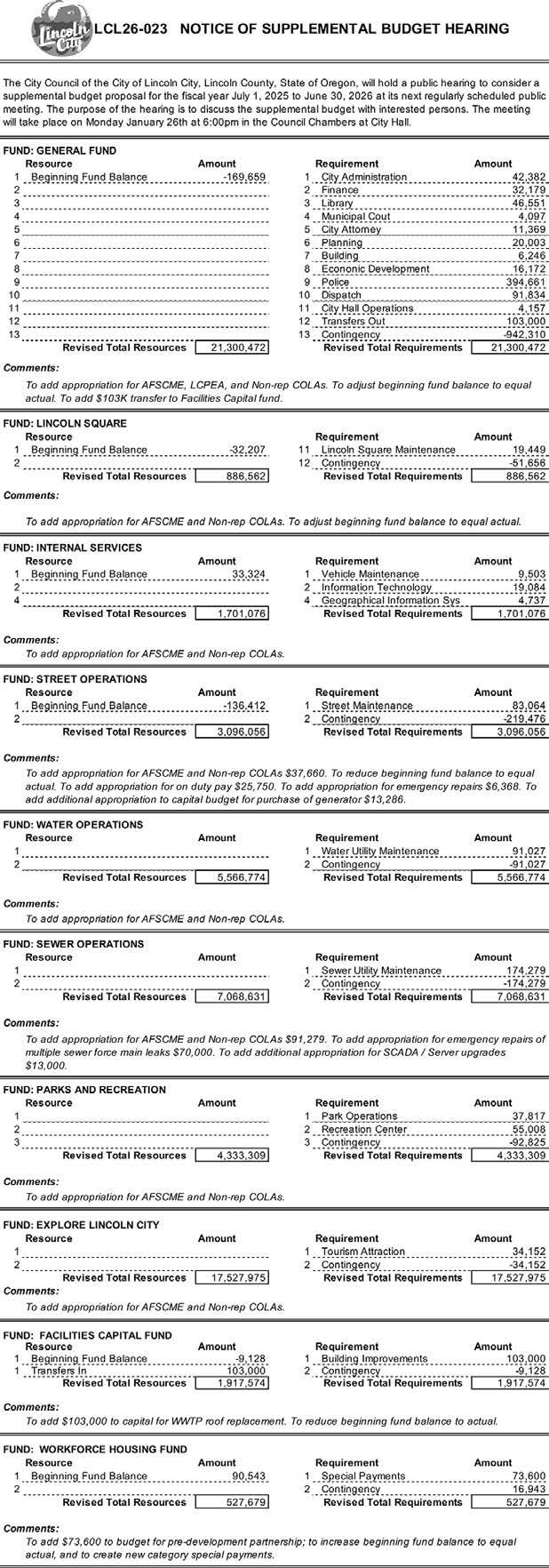 St South Beach, Oregon 97366. Saturday, 1/31/2026 @ 10:00am. C24 - Anna Stravalle, C37 - Angie Graham, N04 - Angie Graham, D29 - Lucy Keith, E29E30 - Philip Meredith, F31 - Holly Torrey, N03 - Rachael Nickerson, R22F - Jose Garcia Villanueva. Sale Subject to Cancellation. Safe-Lock Storage reserves the Right to refuse any and all bids. 1/14/26 1/21/26 LCL26-013 NOTICE OF SHERIFF’S SALE #260013. On February 19, 2026, at the hour of 10:00 a.m., at the Lincoln County Courthouse, 225 W Olive St, Room 203, in the City of Newport, Oregon, the defendants’ interests will be sold, subject to redemption, in the following time share interests, which will be sold individually and all of which are located at 939 NW Highway 101, Depoe Bay, OR 97341, commonly known as THE RESORT AT WHALE POINTE CONDOMINIUMS: (1) Time Share Interest H in Unit 127, (2) Time Share Interest F in Unit 126. The court case number is 25CV45420, Association of Unit Owners of the Resort at Whale Pointe Merged Condominiums, plaintiff vs. Robert Lynn Berry, Sr., Personal Rep-