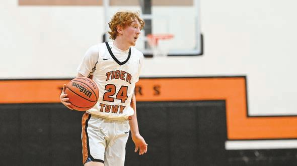 Junior forward Kol Tolan was a problem for the Amity Warriors, racking up 17 points in the Tiger’s win against them on Dec. 16. (Courtesy photo from Lon French)