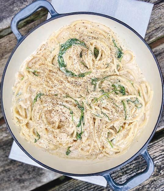 5. Remove from heat then fold in pea tendrils and serve over bucatini pasta and enjoy!