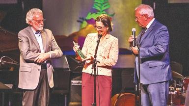 Oregon State Sen. Dick Anderson and State Rep David Gomberg presented the Siletz Bay Music Festival’s Dick Hyman Award to Price at the festival’s award ceremony, Friday evening, Aug. 22