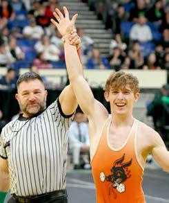 The Dallas High School boys wrestling team celebrates after winning the Oregon State Wrestling 5A Championship Feb. 24 at Portland Veterans’ Memorial Coliseum. It is the program’s third ever title, and first since 2018. The girls’ team also placed second in state. See story, page B1.