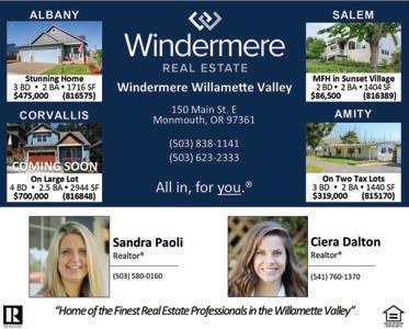 Announcements Deadlines for Classifieds: due at 4pm Friday before publication Bicycles Woman’s 26-inch Schwinn Sidewinder 21 speed, excellent condition, includes helmet $100 - cash only 541678-0205 Fuel & Firewood Two years seasoned fir. $240 per cord delivered. Call 503-606-2644 or text 541-257-7766 Garage Sale Ash Creek Mobile Home Park all park garage sale. May 31June 2 141 S 17th St. Independence 8a.m. 6p.m. 503-838-4552 Garage Sale Hunting, Fishing, Camping, home decor, outdoor tools, gardening, mechanic’s tools, woodworking and miscellaneous household 398 SE Stone Street, Dallas May 30 & 31, 9-5 Garage Sale Tools, Small equipment, dishes, furniture, clothes 1370 SW Ellis St, Dallas 8-3 Fri & Sat May 31 & June 1 Garage Sale My husbands estate sale. I am cleaning house. Power tools, misc. tools, snow board, fishing poles, chairs. art work, furniture, household goods, Alaskan fur poncho (LG) vintage radio. And much more! June 1 & 2. 8:00 AM 101 Edwards Rd. S. Unit #30 Monmouth, Oregon Home Services Semi-retired painter in Dallas for hire. Also parking lot striping and pressure washing Free estimates 503-930-6011 Rental 4 stall barn with 20 acres pasture, use of indoor arena $900 a month also live in RV parking $500 a month or both for $1200 a month 503917-8631 or 503-779-6257 5 Acres for rent next to the new fire station on Kings Valley Highway. $325 a month 503-917-8631 and 503-779-6257 Wanted PAYING TOP $$DOLLAR$$ for sport card collections. Basketball, baseball, football, pokemon. Premium paid for vintage. Call Corey 541-838-0364 *Includes product and labor; bathtub, shower or walk-in tub and wall surround. This promotion cannot be combined with any other offer. Other restrictions may apply. This offer expires 6/30/24. Each dealership is independently owned and operated. **Third party financing is available for those customers who qualify. See your dealer for details. ©2024 BCI Acrylic, Inc. The Bath or Shower You’ve Always Wanted IN AS LITTLE AS A DAY (844) 847-9778 CALL NOW OFFER EXPIRES 6/30/24 $1000 OFF No Payments & No Interest For 18 Months AND & Donate Your Car Imagine the Di erence You Can Make Vehicle donations are fully tax-deductible and the proceeds help provide services to help the blind and visually impaired. Help Prevent Blindness Get A Vision Screening Annually FREE TOWING & TAX DEDUCTIBLE a $200 restaurant voucher ✔ a 2-night, 3-day hotel stay at one of 50 locations Call 1-844-533-9173 When you donate your car, you’ll receive: + See Representative for full warranty details. *One coupon per household. No obligation estimate valid for 1 year. 1Subject to credit approval. Call for details. AR #0366920922, CA #1035795, CT #HIC.0649905, FL #CBC056678, IA #C127230, ID #RCE-51604, LA #559544, MA #176447, MD #MHIC148329, MI # 2102212986, #262000022, #262000403, #2106212946, MN #IR731804, MT #226192, ND 47304, NE #50145-22, NJ #13VH09953900, NM #408693, NV #86990, NY #H-19114, H-52229, OR #218294, PA #PA069383, RI #GC-41354, TN #7656, UT #10783658-5501, VA #2705169445, WA #LEAFFNW822JZ, WV #WV056912 2010%% OFF OFF Your Entire Purchase*Seniors + Military ++ We o er financing that fits your budget!1 1-855-536-8838 CALL TODAY FOR A FREE INSPECTION! Receive a free 5-year warranty with qualifying purchase*valued at $535. Call 877-557-1912 to schedule your free quote! PORTABLE OXYGEN FOR YOUR ON-THE-GO LIFESTYLE CLAIM YOUR RISK-FREE TRIAL 14-DAY Call us toll-free at 1-855-839-0752 14-day risk-free trial- Return within 30 days of purchase for a full refund of purchase price. PM230469 EN_EX_USA | Rx Only. © 2023 Inogen, Inc. 301 Coromar Drive, Goleta, CA 93117 Inogen® is a trademark of Inogen, Inc. The usage of any Inogen, Inc. trademark is strictly forbidden without the prior consent of Inogen, Inc. All other trademarks are trademarks of their respective owners or holders. Get Screened for Risks of Stroke and Cardiovascular Disease Special Screening Package for $149 Call 844-655-0972 Are you at risk? LOOK to us for your Real Estate needs... 50 years of Quality Service. Locally owned & operated SINCE 1974. 503 -838-1912 1697 Monmouth St., Independence Licensed Mobile Home Dealer Member Willamette Valley Multiple Listing Service • View our listings at www.ccablerealty.com • Colby Jackson Broker 541-778-3288 Tanna Cable Girod Broker 503-931-6800 Timm Cable Broker 503-551-5357 Kody Kantola Broker 503-302-1833 3 LOVELY HOME IN 55+ COMMUNITY.3bd/2bath home was updated in 2014 with a new roof, siding, heat pump, cabinets, countertops and flooring. Flexible floorplan with eating nook and formal dining $129,900 (# 816032) COZY HOME! - This gem of a home is a pallet to add your own cosmetic touches to and have your own space. This home is cozy and offers a nice open concept. Split 2bd/2bath layout is practical and functional. New roof. $69,900 (#814544) BEAUTIFUL HOME - Located just outside the rural community of Pedee. 3bd/2.5 bath home with open concept. Primary suite on the main level. Covered porch and paver patio is perfect for relaxing or entertaining. Room for RV parking. $565,000 (#814495) NEW LISTING! - 2bd/2bath fully equipped and move in ready home on one level. Primary suite has dual closets, dual sinks and step in shower. 2nd bd and bath are separate from the master-makes great guest space or office. $405,000 (#817067) THIS WEEK’S FEATURED HOMES Franki Cable Broker 503-569-9649 Call today and receive a FREE SHOWER PACKAGE PLUS $1600 OFF With purchase of a new Safe Step Walk-In Tub. Not applicable with any previous walk-in tub purchase. Offer available while supplies last. No cash value. Must present offer at time of purchase. CSLB 1082165 NSCB 0082999 0083445 1-833-395-1433 Visit our website, www.polkio.com