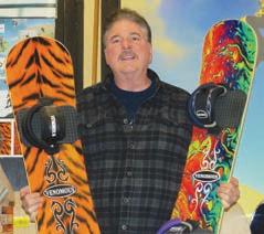 Lon Beal, this year’s Rhododendron Days Grand Marshall, standing in his shop with two sandboards produced by his company.
