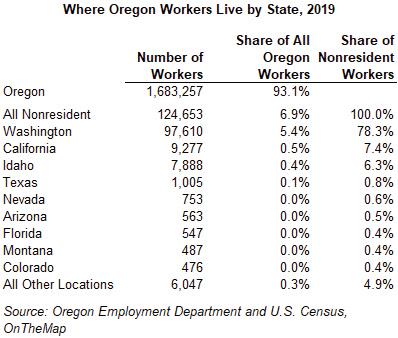 Roughly 7% of people who make their living in Oregon make their home in some other state. Not surprising to anyone driving the bridges over the Columbia River during rush hour, almost four out of every five of these nonresident workers come from Washington.