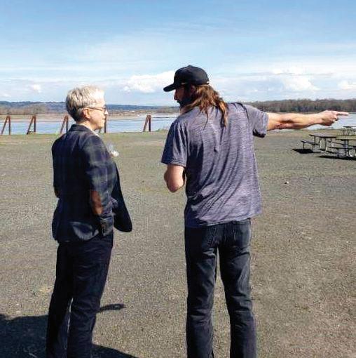 St. Helens Major Rick Scholl points out to Gov. Kotek, the city’s planned waterfront development along the Columbia River.
