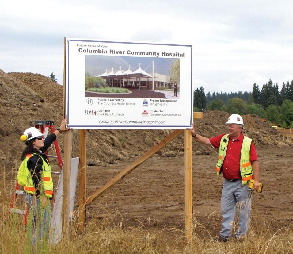 Workers posed in front of a sign at the site depicting an artist’s rendering of the Columbia River Community Hospital. The hospital was never built.