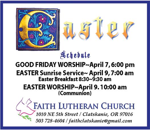 www.thechronicleonline.com Wednesday, April 5, 2023 A10 Columbia County’s trusted local news source St. Helens Community Bible Church 35031 Millard Rd PO Box 254, St. Helens, OR 97051 April 7 Friday 6pm Good Friday Service April 9th Sunday 8:30-9:30am Easter Breakfast 9:45-10 :45am Adult and children Sunday School classes 11:00am Easter worship service 101 East ‘C’ Street 503-556-3440 Easter service at 9:30am Rev. Dan Thompson-Aue Rainier United Methodist Church https://us02web.zoom.us/j/83366636499?pwd= dkdIMm92WnFCRE8xZ2dqeGR4eUZDQT09 Meeting ID: 833 66636499