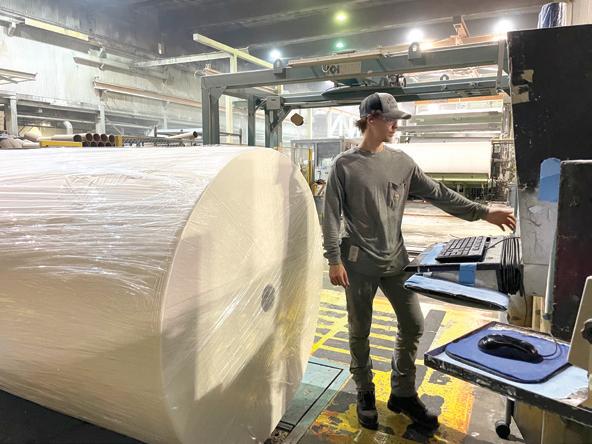 COURTESY PHOTO Spencer Dunbar, fifth hand on No. 1 Paper Machine, prepares to label a roll of Angel Soft® bath tissue.