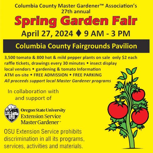 https://ccaoregon.ejoinme. org/2024ColCounty. The awards dinner will be held on Saturday, May 11, at the Columbia County Chapter’s annual banquet beginning at approximately 6:30 p.m. at the Columbia County Fairgrounds, 58892 Saulser Rd., St. Helens, Oregon, 97051. Along with presenting