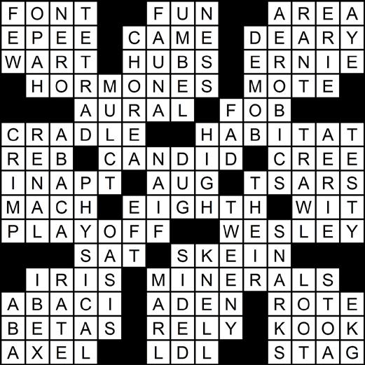 *Estrogen and testosterone 20. Tiny piece of anything 21. *Pertaining to ear 22. Pocket watch chain 23. Bed “on the tree top” 26. Home ground 30. Yankee’s foe 31. Heart-to-heart 34. First Nation nation 35. Clumsy 37. Summer mo. 38. Boris Godunov and Nicholas Romanov 39. ____ 1 jet speed 40. Last in octad 42. Intelligent humor 43. Win or go home competition 45. Actor Snipes 47. Not stood 48. Knitter’s unit 50. *Eye part 52. *Vitamins’ partners 55. Old-time calculators 56. Port of Yemen 57. Memorization method 59. Greek Bs 60. Bank on 61. Crazy one 62. Yamaguchi or Hamill’s jump 63. *”Bad” cholesterol, acr. 64. Rudolph, e.g.