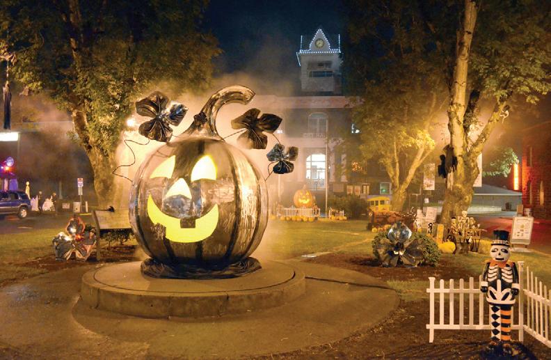 • The Dark Market offers Spirit of Halloweentown mer chandise.Themost popular event of Spirit of Halloweentown is the lighting of the giant pumpkins. Participants start the holiday season by counting down the seconds until two giant pump kins are lit in the city’s historic townInsquare.2022,the Pumpkin Lighting Ceremony takes place on Saturday, October 1. One pumpkin is a replica of the gi ant pumpkin featured in “Hal loweentown” and the other is an enormous work of steam punk metal art. The pumpkins, which both stand over six feet tall, are available for photo op portunities every day until the end of October. The plaza is home to many other photo op portunities such as huge crows and an over seven-foot-tall hand carved scarecrow. General admission tickets to Spirit of Halloweentown, along with special celebrity engagement tickets and a full list of events, are available on the festival’s website at spiritofhalloweentown.com.www.