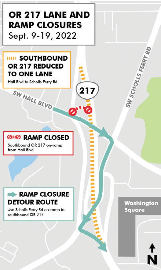 This means that south bound OR 217 will be reduced to one lane between SW Hall Boulevard and SW Scholls Ferry Road for the whole 11-day period. Plan for delays on the highway and surrounding area. If you can, limit the amount you use OR 217, combine trips and/or shift your travel time away from the morning and evening commute. Check tripcheck.com before you leave for up-to-date traffic impacts.Aswith all construction, the closure schedule is sub ject to “Wechange.knowthis will be a disruption for many travel ers and we’re working hard to complete this necessary work as safely and quickly as we can,” ODOT said in an online advisory. “We appreci ate your patience!”