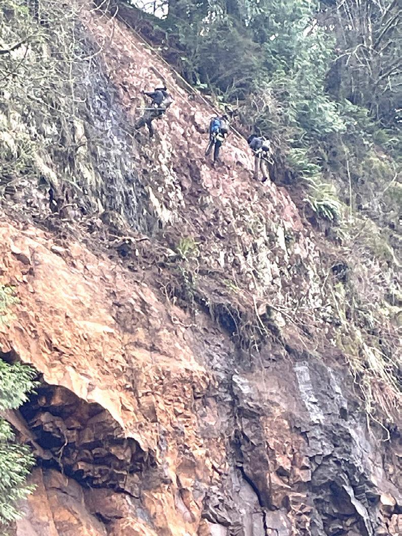 This week crews were working down the cliff side to remove large sections of loose rock left by the landslide. This hazardous rock scal ing work must be done during day light and coordinated with cleanup at the highway surface to keep crews safe, according to ODOT Maintenance District 1 Manager Mark Buffington. “It is too dangerous and compli