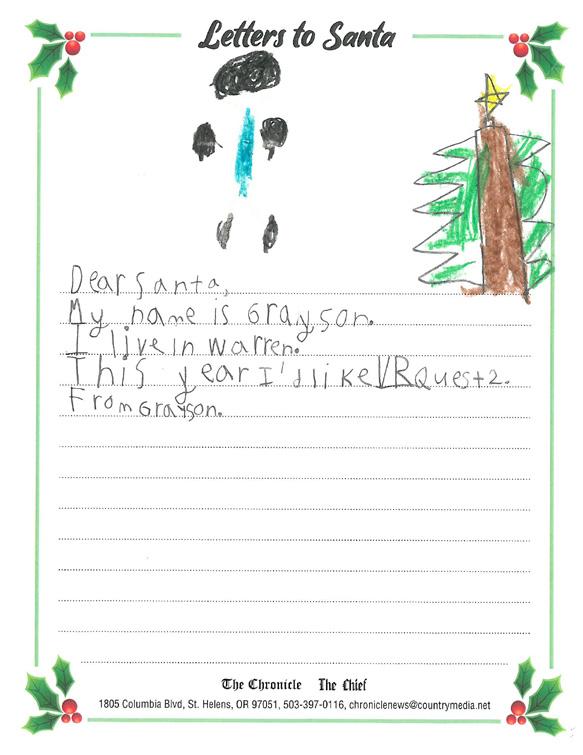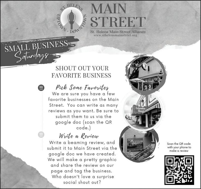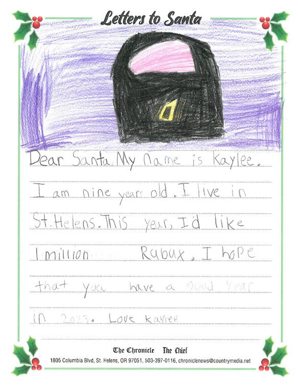 Wednesday, December 14, 2022 Columbia County’s trusted local news source 2035 Columbia Ave , St. Helen’s, OR. 97051 STOREWIDE BLACK FRIDAY/SMALL BUSINESS SATURDAY SALE 10%-50% off www.christinaschest.com Open Noon to 6 PM, Sunday hours 11-4pm (971) 895-1239 • 2035 Columbia Ave, St. Helens Interesting, quality new and used items at great prices. Something new every time! CONTACT US amara@sthelensmainstreet.org Call or Text 971-842-6000 Premier Chocolate, Ice Cream & Sandwich Shop 2017 Columbia Blvd. St. Helens, OR 97051 Phone: 503.366.9602 Mon-Sat 10-4 Locally Owned and Operated Follow us on Facebook Ornaments, Holiday Decor Espresso • Music Accessories • Gourmet Foods Gifts • Sugar Free Candies • Greeting Cards Assorted Candies Thank you for shopping local this holiday season! Visit sassathome.com for your holiday shopping Monday - Friday 8am-6pm, Saturday 11am - 3pm 58105-B Columbia River Hwy, St Helens, OR 97051 503-410-5197 Letters to Santa From your friends at The Chronicle Happy Holidays