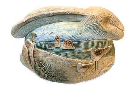 The collection expands into three dimensions with ceramic sea swirls by Annabelle Stien. The latest in the series of Sara Fine’s Cannon Beach Bunny sculptures. New glass flowers and mosaics by Beth Anderson. Fused glass & pen & ink collage by Eileen Downes. As well as Phil Seder’s newest wood and metal shorescape series featuring an octopus.