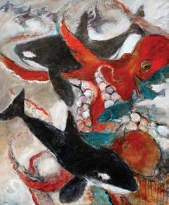 Christopher Mathie is well known in the gallery for energetic abstractions that reference coastal landscapes. The Washington artist has gained a reputation for impressionistic seascape paintings that harness raw emotions, immediacy and intentional mark making into large scale canvases. In his dynamic painting process, Mathie builds up layer upon layer of textural paint, giving his finished pieces lively and inviting surfaces with a complicated sense of color. His new collection for Spring Unveiling draws from recent travels to Thailand where Mathie experienced a different approach to seeing and art making. Using sea-life forms and bold vibrant compositions, Mathie’s new paintings celebrate the interconnectedness of living creatures.