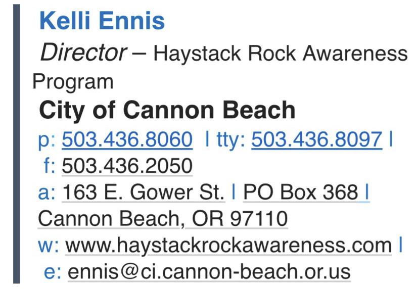 resources while being respectful of all of the fascinating creatures that live in the rocky areas and tide pools around Haystack Rock. Kelli’s mission at HRAP is to help get that message out while bringing awareness to visitors of why it is so important to care for our fragile ecosystems. Haystack Rock encompasses a unique ecosystem, and teaching visitors about awareness of responsible environmental stewardship can begin at Haystack Rock. Her passion and mission is to make a difference for ecosystems everywhere.