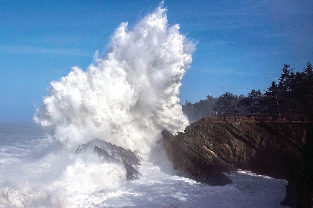 High waves crashing against the shoreline at Cape Arago along the Oregon Coast.