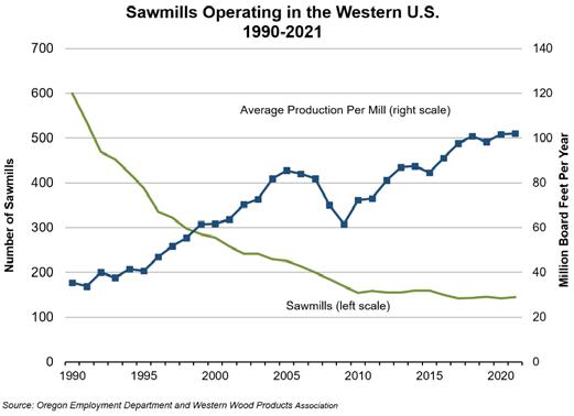 In addition to new technologies, smaller mills were shuttered, creating efficiency through economies of scale (larger mills can produce more per worker). The average production of sawmills operating in the western U.S. increased as smaller mills were shuttered and efficiency increased through economies of scale and new technology. Between 1990 and 2021, the number of mills in the western U.S. dropped from 600 to 144 while average production per mill increased from about 35 million board feet per year to 102 million board feet per year.